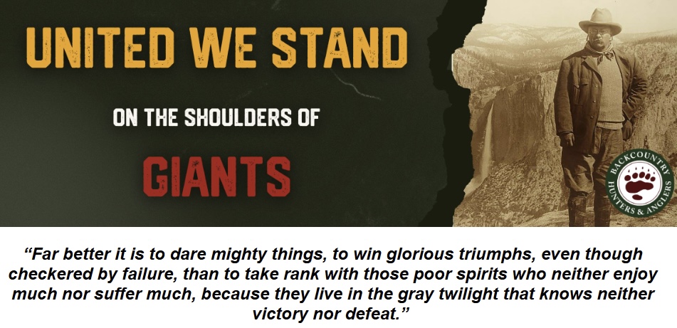 Garrett spoke at BHA’s North American Rendezvous in Missoula during the Rally For Public Lands (on June 15). He shared a story of military service, love of the outdoors, redemption, and hope. He drew a line in the sand on public land sales and urged us to be “giants” of conservation, like Roosevelt and so many others who came before us.[4] We won’t let him (or them) down.