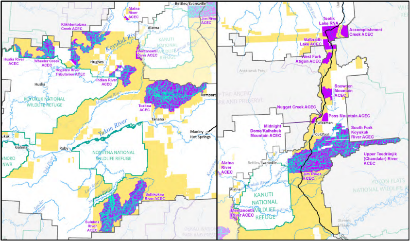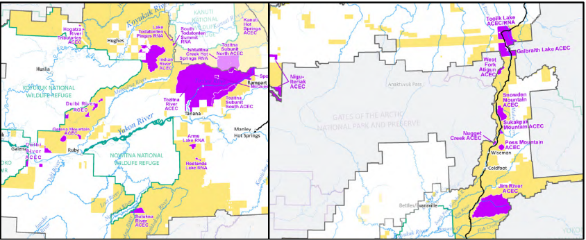 ACECs and RNAs included in the proposed alternative from 2024 final plan (Alternative E). Yellow=BLM land, purple = ACEC or RNA. Maps cropped from Final BLM Central Yukon RMP