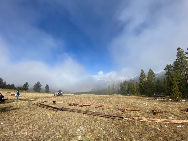 Friday’s rain, snow and cold temperatures didn’t deter the volunteers; as the fog lifted in camp on Saturday morning a beautiful Idaho fall day was revealed, with fresh snow on the mountains and fall colors on the trees. By the end of the weekend, volunteers had built 920’ of jackleg fence, helped finalize the removal of over two miles of unauthorized routes, installed two trail restrictors, and constructed 1.2 miles of 50” trail.