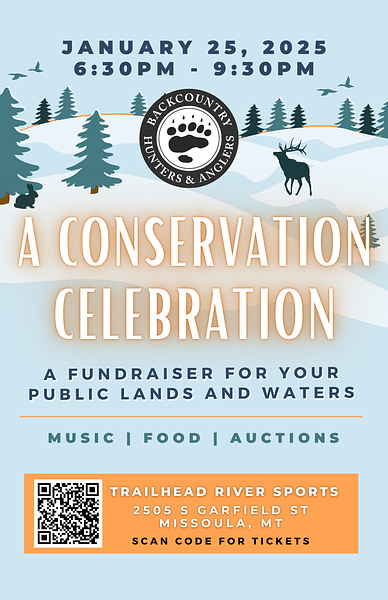 You're invited to join the Montana Chapter of Backcountry Hunters & Anglers at the Trailhead River Sports in Missoula on Saturday, January 25th at 6:30pm for a night of music, food, raffles, auctions, and camaraderie! We'll raise a glass to a successful 2024 and look ahead to 2025 where another legislative session will have begun. We'll have silent auction packages, exclusive raffles, food, drinks, and music - and all proceeds will go towards the chapter's continued work for Montana's public lands and waters.