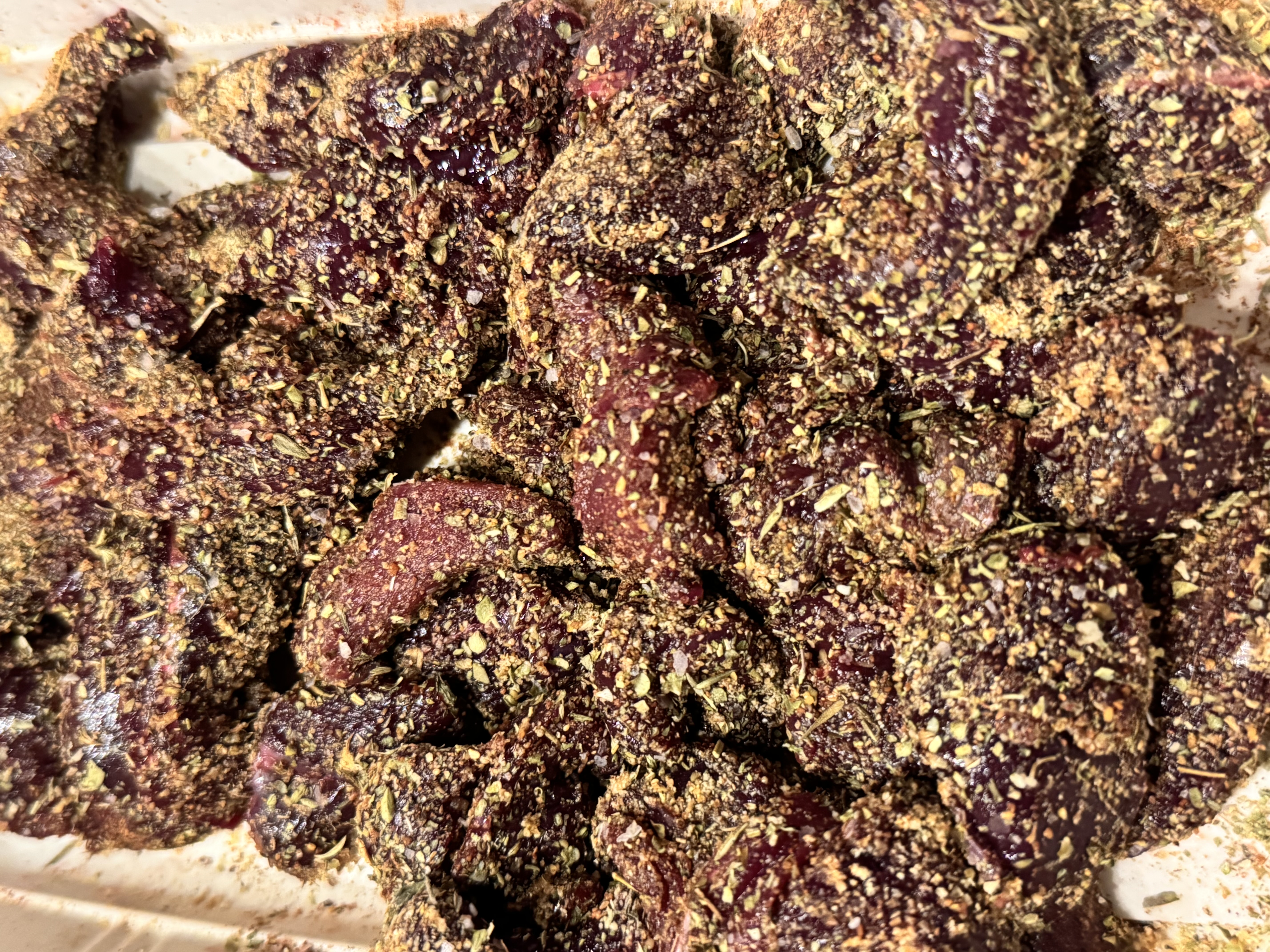 Start by slicing your duck breasts very thin—honestly, as thin as you can. Toss the slices into a bowl and mix in the spices, coating the meat thoroughly. Set aside.