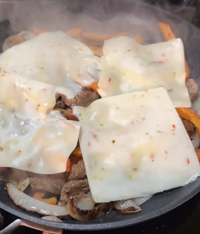 Once the duck is browned on the outside, add the slices of Pepper Jack cheese over the duck, onion, and pepper mixture. Lay your cheese sauce covered hoagie into the pan, so the bread softens and the cheese sauce warms. Put a lid on this to maintain the moisture and help quickly melt the cheese. Once the Pepperjack is melted, remove the bread, and scoop the cheesy meat and veggies to the sauce covered hoagie and enjoy!