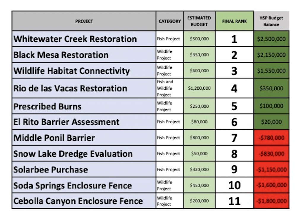 The August 15th public meeting was organized for the Committee to determine priorities for funding among the applicants. Prior to this meeting, Committee members individually studied detailed materials for each of the submissions, and submitted a ranking (from 1 to 11) for each application based on analyses of the relative values and costs of each. Early in the meeting, NMDGF staff indicated that available funds are expected to be about $3,000,000, while total requests totaled $4,800,000. After introductions and a summary of the work to be completed, the Committee discussed each submission, commenting on each based on the application materials and their own expertise, with every member discussing and offering rankings for each submission. This required approximately 4 hours.