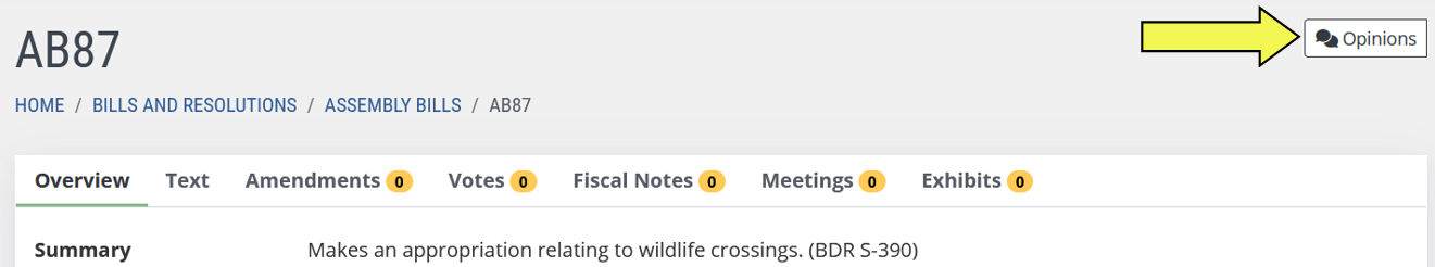 As the 83rd Session of the Nevada Legislature continues, here is an update on the bills that we are following. You can click on the title of each bill below to be redirected to the bill’s webpage. Once there you can submit your opinion by clicking the “Opinions” box to the right of the bill. Example below: