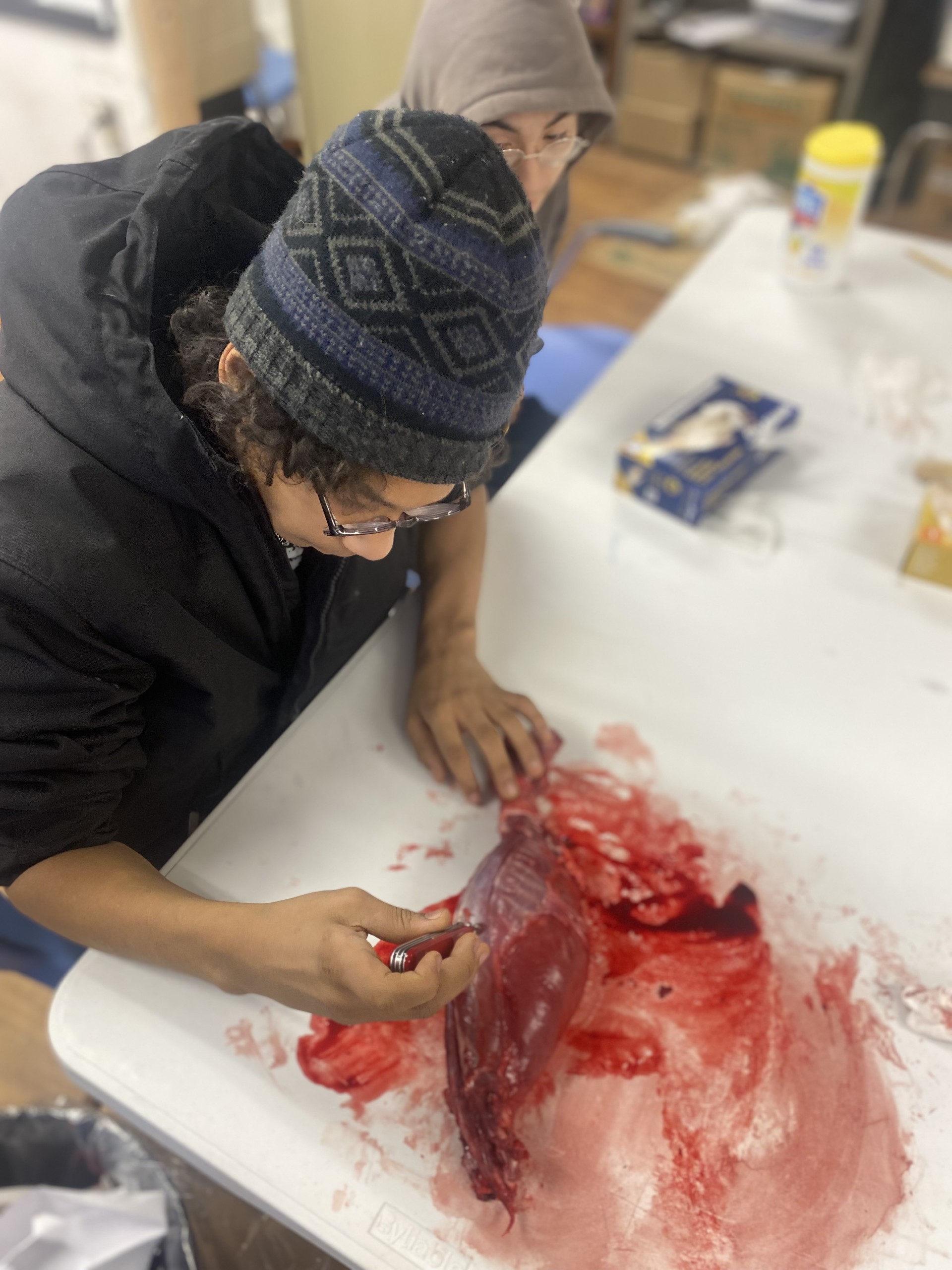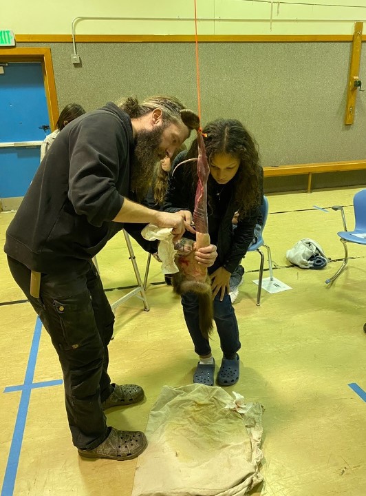 Ryan Bandy showing a student how to skin and preserve the fur of a marten.