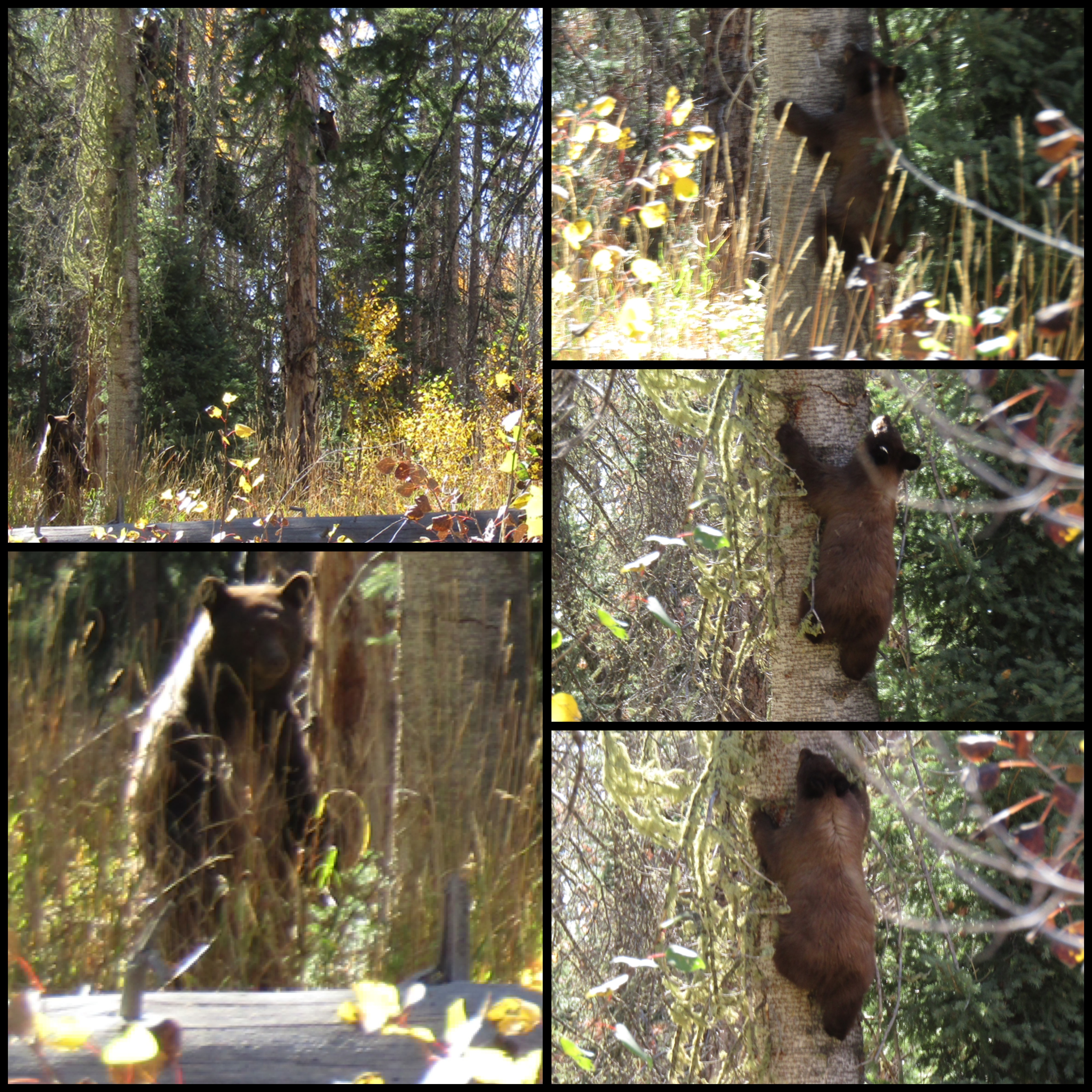 While returning to camp on October 3rd, in the vicinity of the raspberry patches Rick Hooley and I reconnoitered during August, there was a ruckus (i.e., movement and flashes of brown fur) off the trail about 300 feet away. A mule deer or elk maybe? Nope, a black bear sow with cubs. The cubs apparently saw me first and were (all 3 of them) frantically climbing nearby trees.