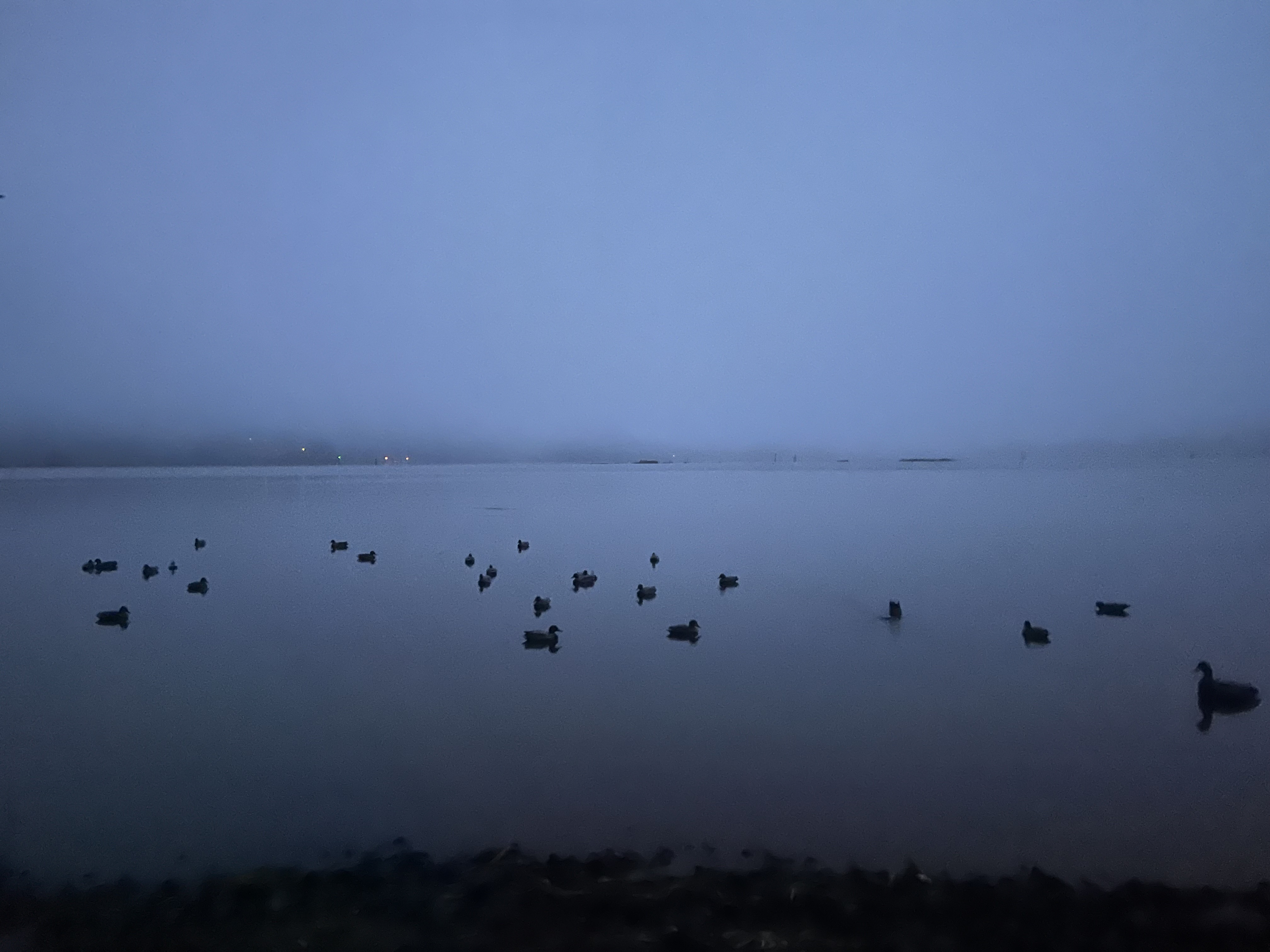 As visibility improves, we see birds. Thousands of them in the middle of the lake; on the water and flying overhead. There isn't a single location we can see where they are going near shore. These birds have been hunted and are smarter that those of us trying to lure them in through the fog. We watch as they get harried by bald eagles, clouds of wings glimmering over the water as they rise in unison and settle down again well outside of gun range.
