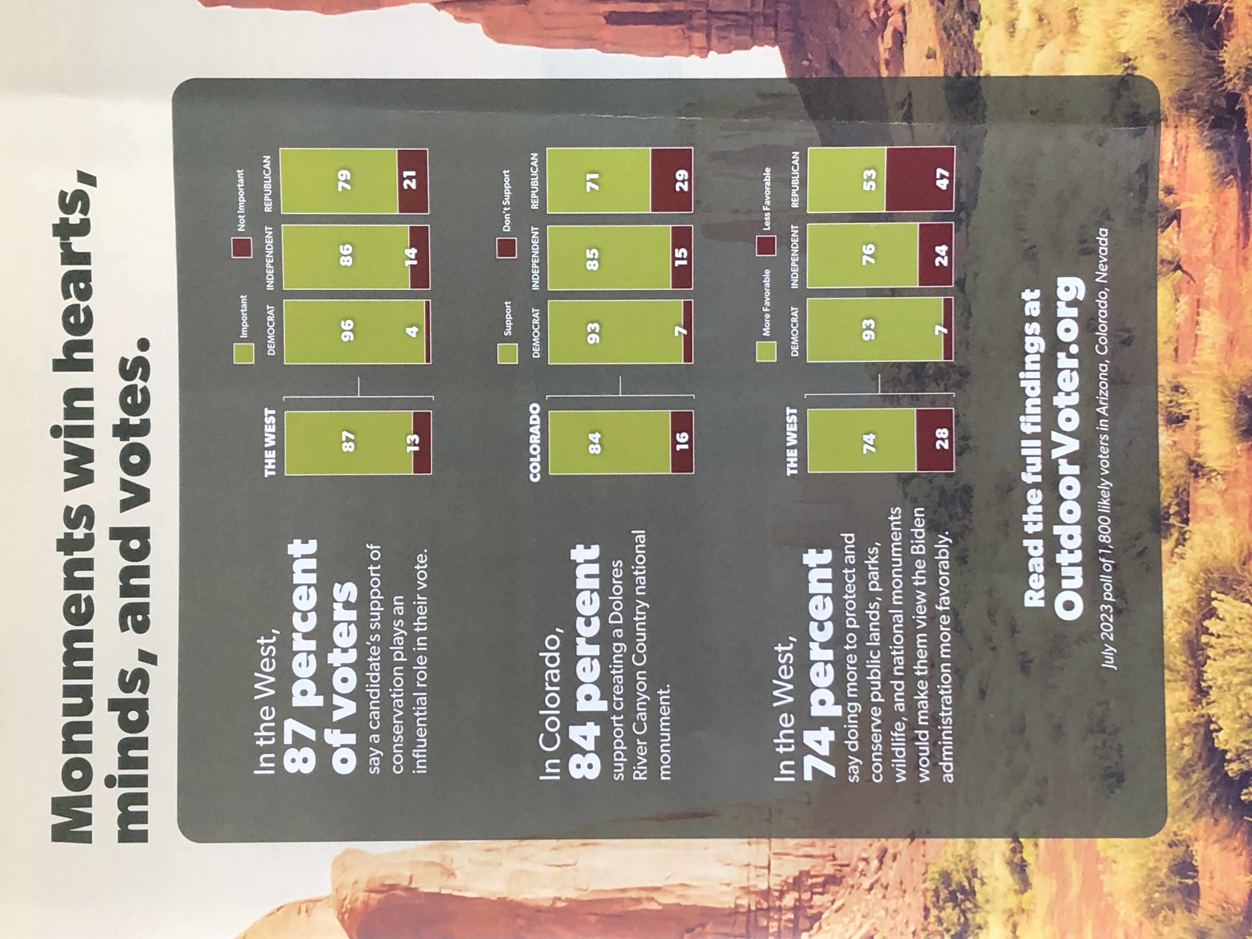 However, many residents in western Colorado want something bigger. A 2023 survey of 750 voters in five western Colorado counties (Dolores, Mesa, Montezuma, Montrose and San Miguel) and the state’s 3rd Congressional District (represented by Laurean Boebert) showed a strong majority supporting a new national monument across the entirety of the 184-mile river, covering more than 500,000 acres.[9]