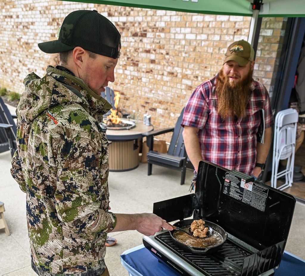 After a short break, the event shifted outside, where presenters described and demonstrated different turkey calls and provided scenarios of when – and when not – to make them. Attendees and presenters discussed gear and took questions over barbecue and beers while Hebeisen prepared wild turkey nuggets from last year's bird. The crowd left with full stomachs, inspired to dive into turkey hunting.