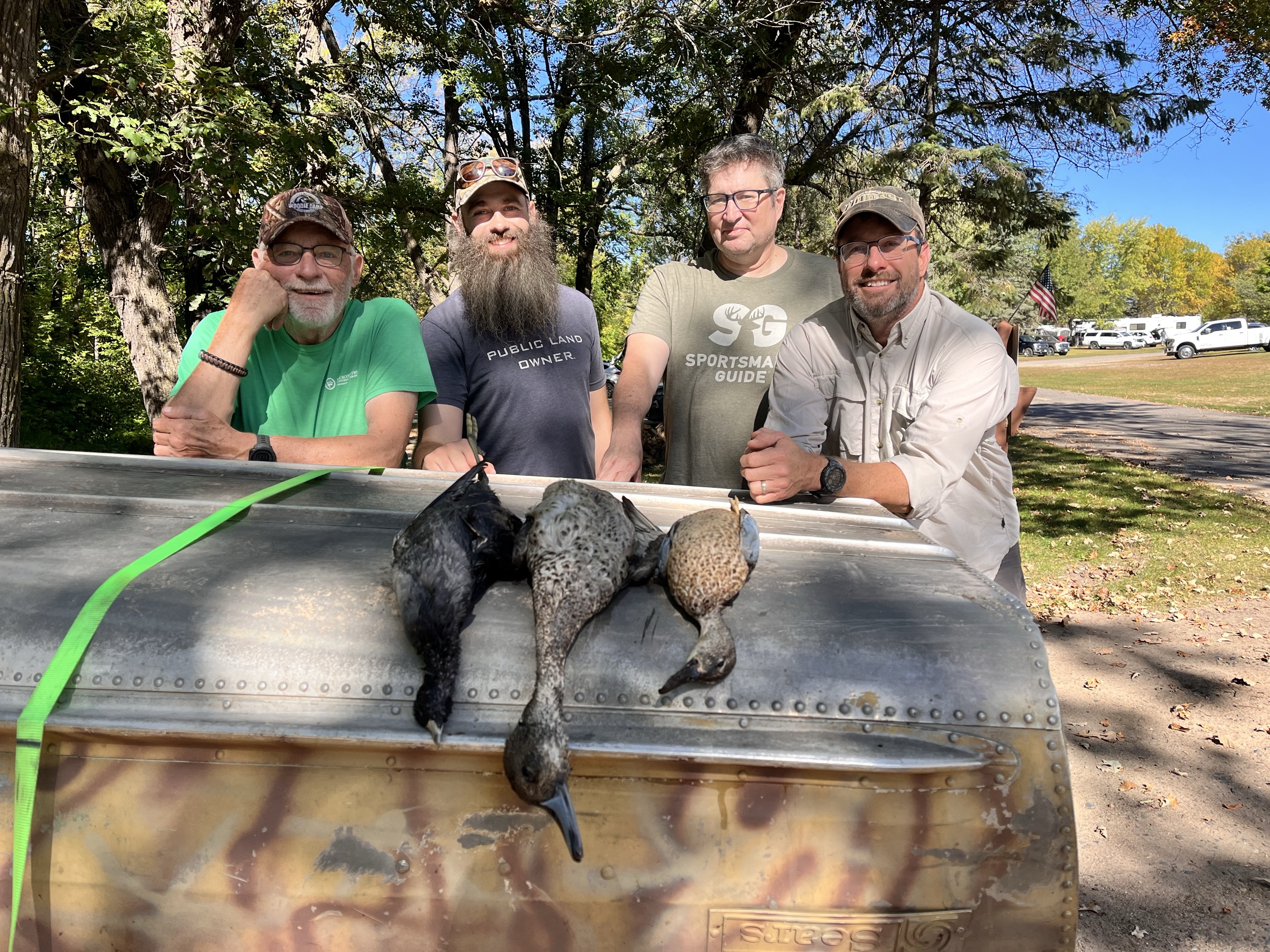 Following an evening of scouting and game planning, volunteers rose from the USACE campsites before dawn to take to the backwaters and channels of Big Sandy Lake to see if conservation karma would reward them for Friday’s work. The foggy sunrise of National Public Lands Day and National Hunting and Fishing Day yielded plenty of birds in the area, though bluebird conditions made the hunting increasingly difficult throughthe morning. New dogs were trained, and hunters Mark Preston and Phil Honzay both connected on ducks, including the teal 59-year-old Preston shot on his first-ever duck hunt! Congratulations, guys!
