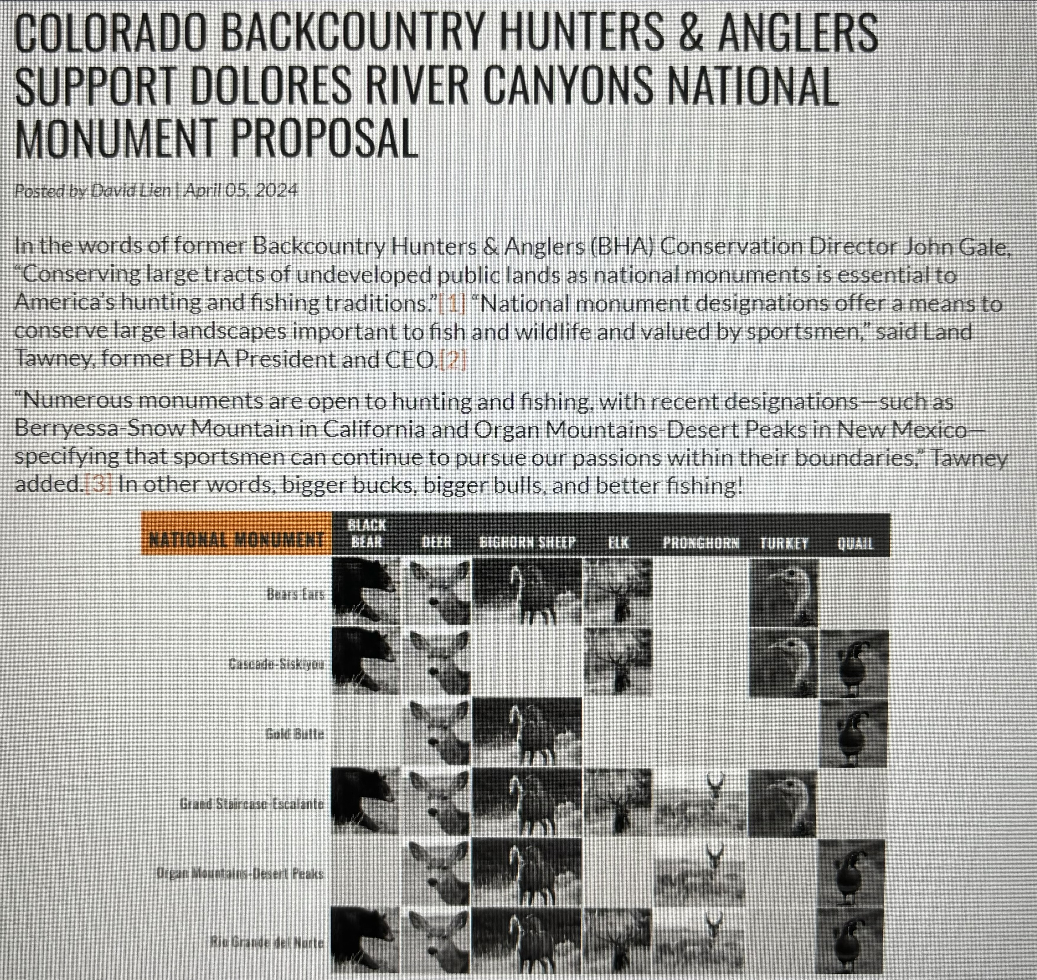 [14] “Colorado Backcountry Hunters & Anglers Support Dolores River Canyons National Monument Proposal.” Backcountry Hunters & Anglers: 4/5/24.