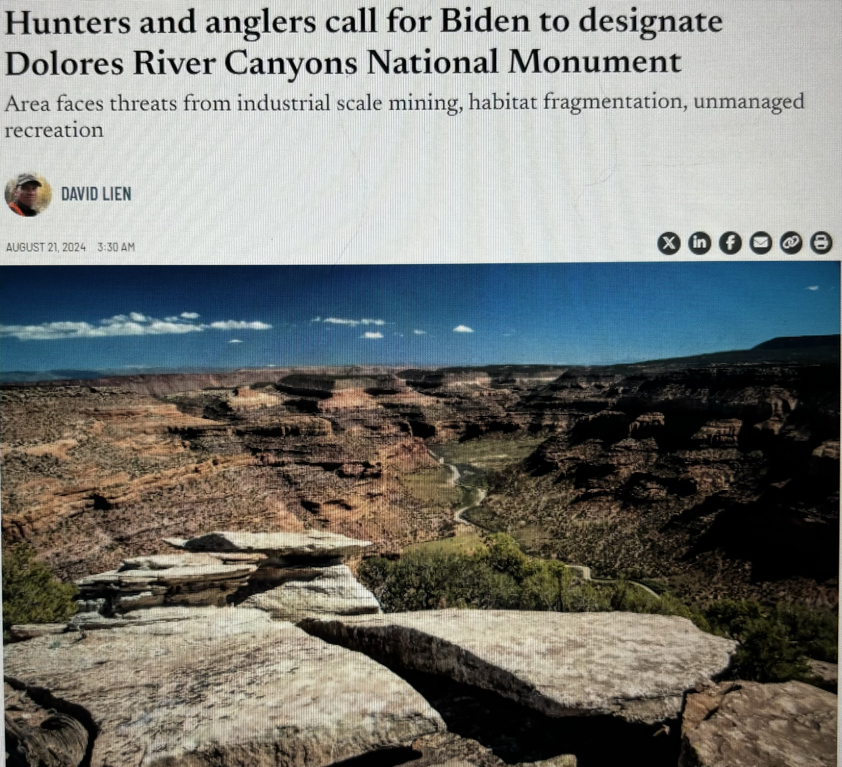 -“Hunters and anglers call for Biden to designate Dolores River Canyons National Monument: Area faces threats from industrial scale mining, habitat fragmentation, unmanaged recreation.” Colorado Newsline: 8/21/24.
