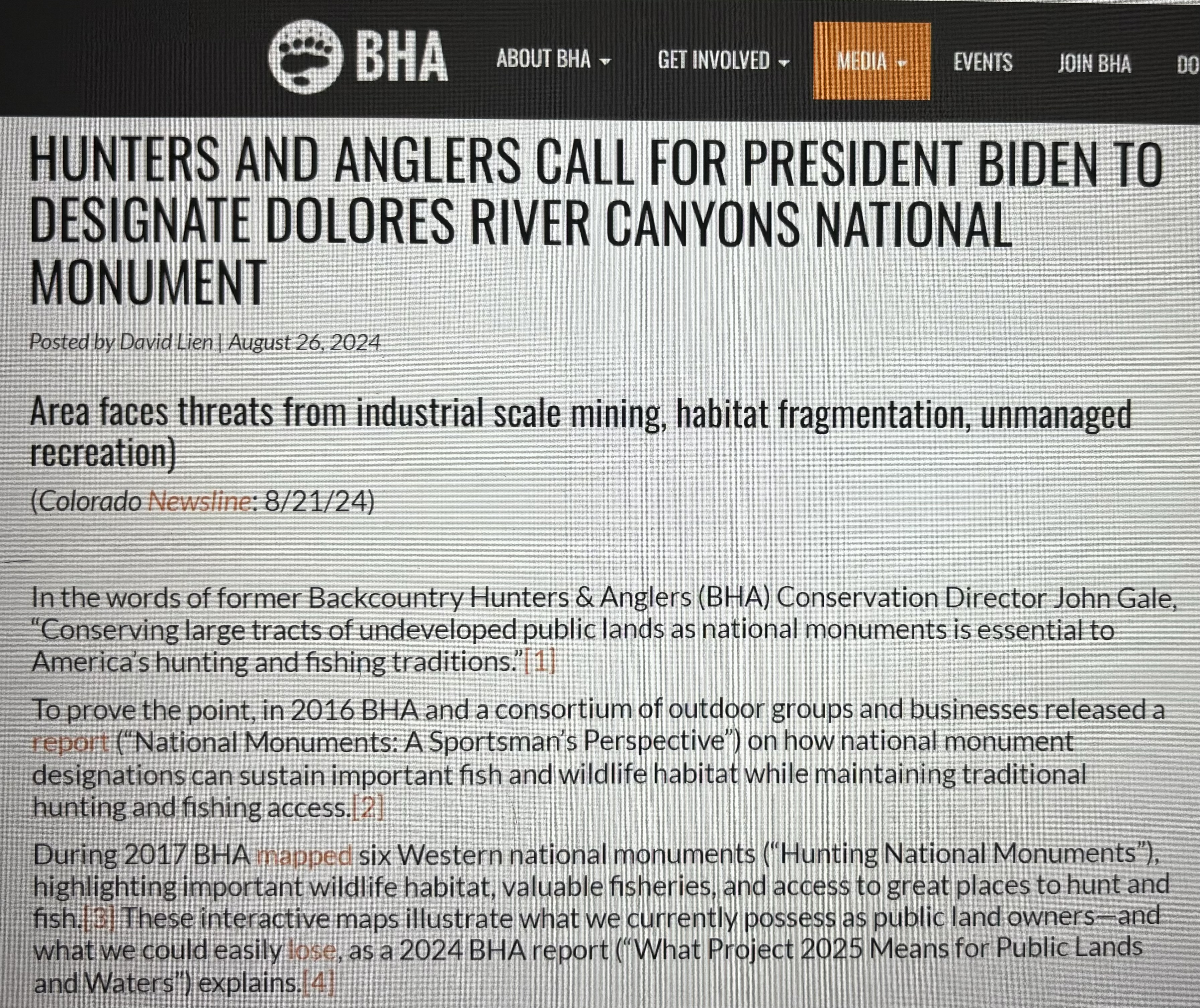 -“Hunters And Anglers Call For President Biden To Designate Dolores River Canyons National Monument.” Backcountry Hunters & Anglers: 8/26/24.