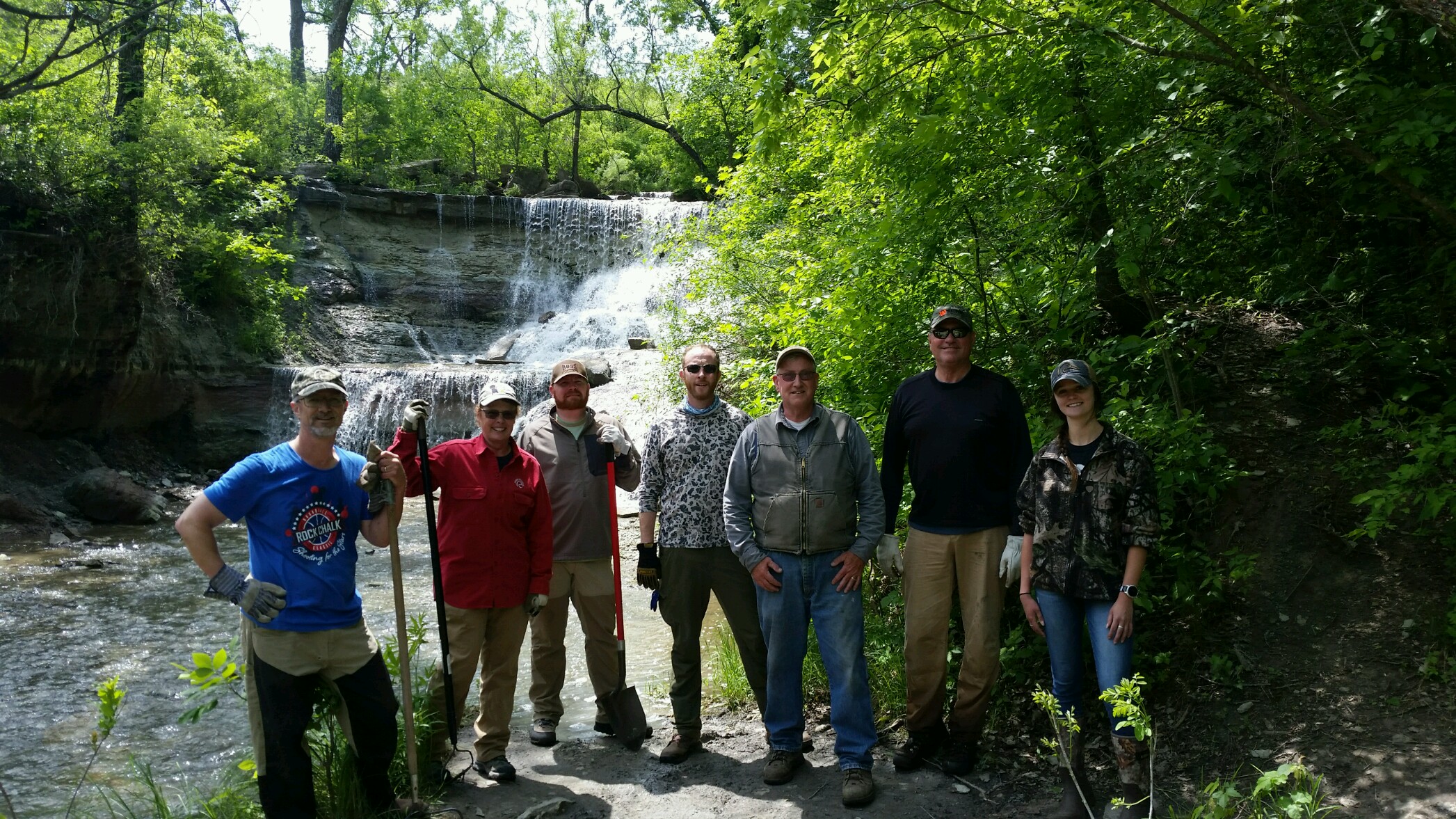The only problem in this whole scenario is that if you want to see the waterfall from the bottom, you needed to go down a steep trail that is occasionally slick and muddy. Brent Konen, Public Lands Manager for the area, coordinated efforts with Kansas BHA Board member Josh Nicolay to set up a volunteer project to work on the trail to the bottom of the waterfall and improve its safety. While the wild characteristics of the trail were maintained, BHA volunteers removed a few small trees, moved some logs and cleared brush to give easier access. Some landscape timbers were placed in strategic places and larger tree roots were allowed to remain, all of which now provide footholds on the slippery slope of the trail. Finally, a layer of mulch was laid down on the trail to establish a little texture to the muddy surface. With Memorial Day weekend just a few days away, it was hoped the holiday crowd would now be able to see this beautiful little corner of Kansas without safety concerns.
