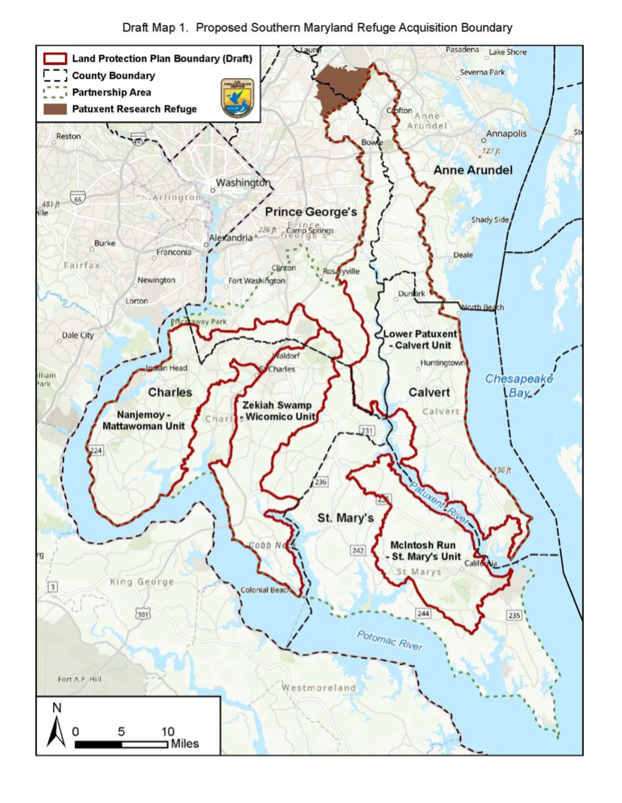 Future Expansion: The Service aims to conserve up to 40,000 acres of essential wildlife habitat across Anne Arundel, Prince George’s, Calvert, Charles, and St. Mary’s counties within four watershed-based focus areas, covering an acquisition boundary of about 577,420 acres.