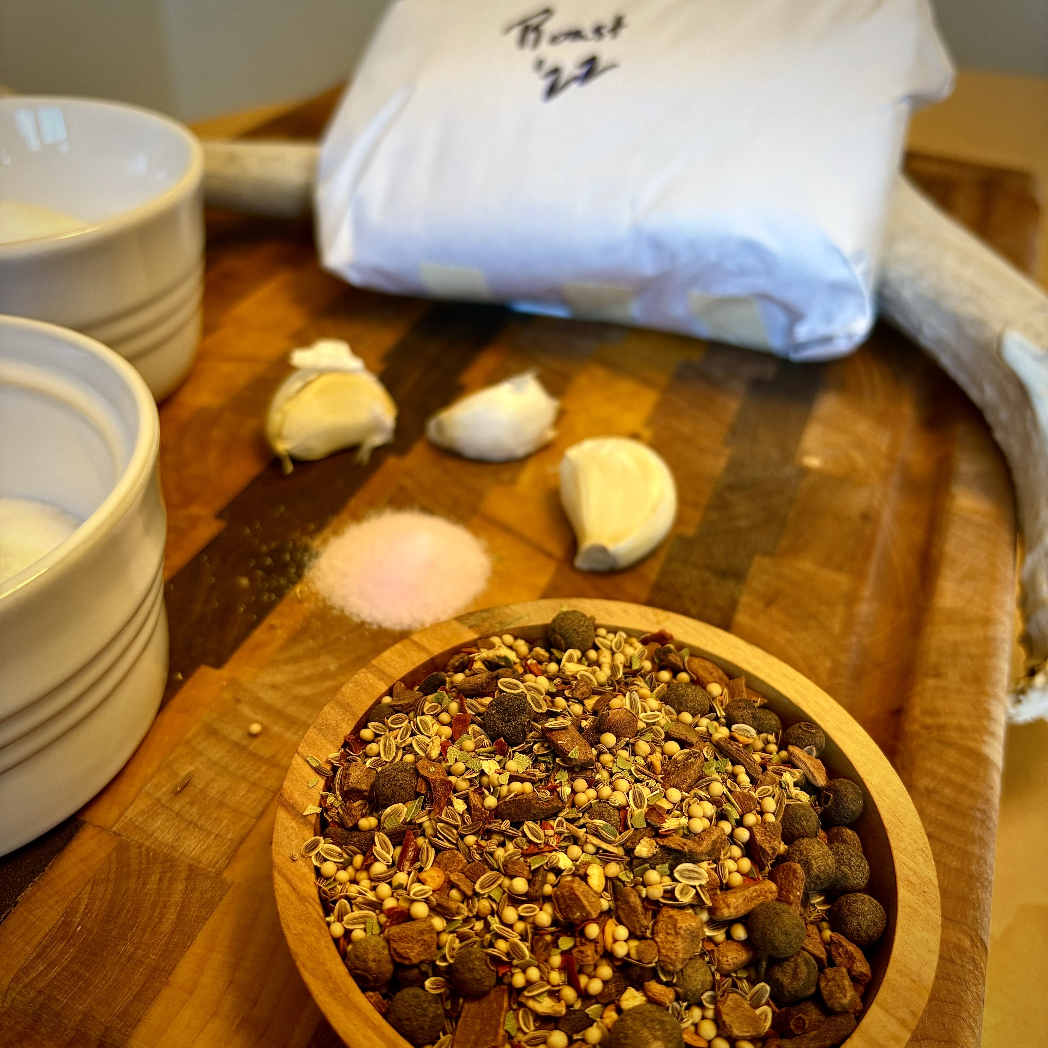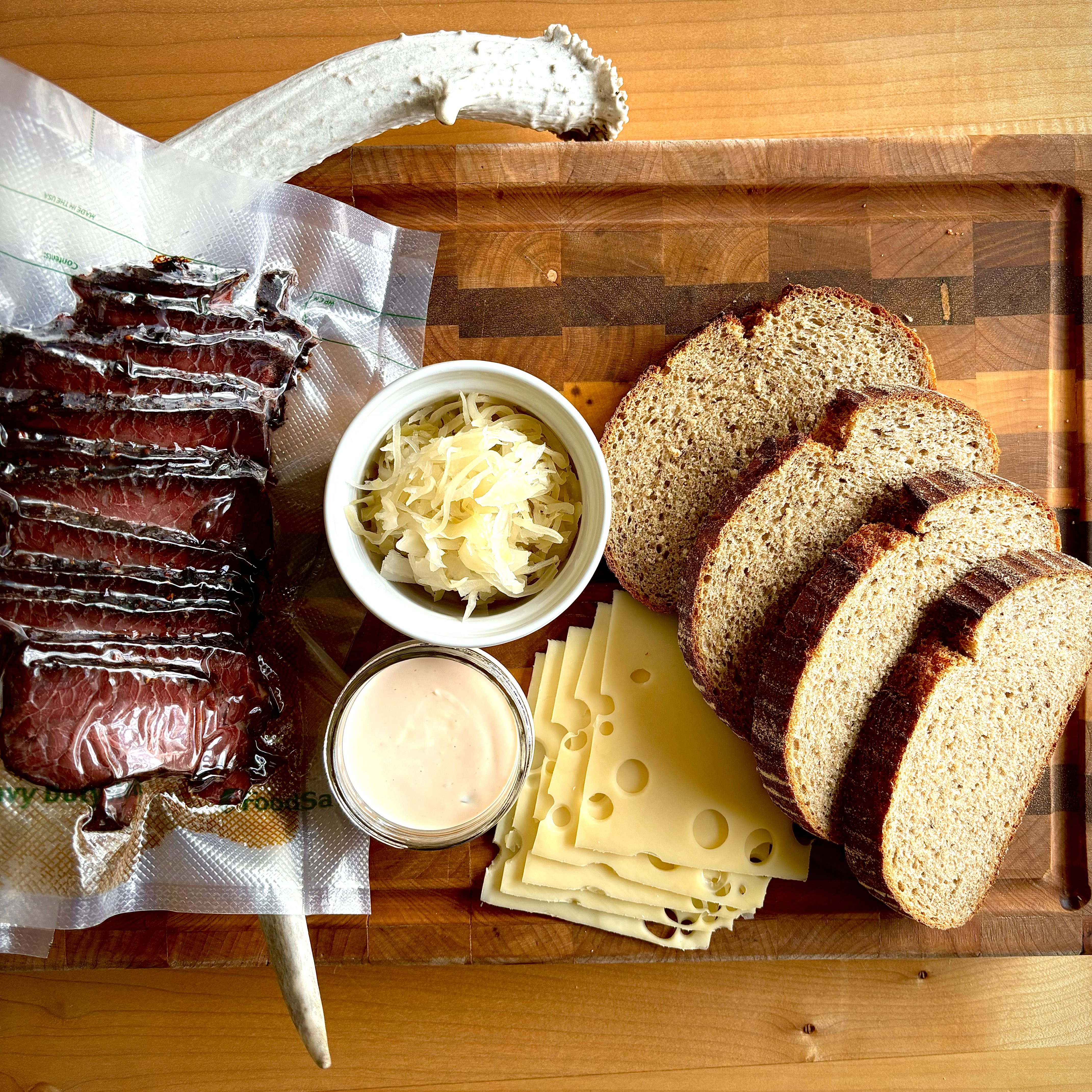 Not just a Saint Patrick’s Day novelty, this meal can undergo creative variations and sustain you year-round. Hearty and versatile, corned roasts are perfect for serving large groups and, as I learned this year, ideal for repurposing as leftovers. The following recipe offers a spin on a deli classic—the Reuben sandwich—made with a 3-5 pound corned-then-smoked mule deer roast and homemade Russian dressing. Enjoy!