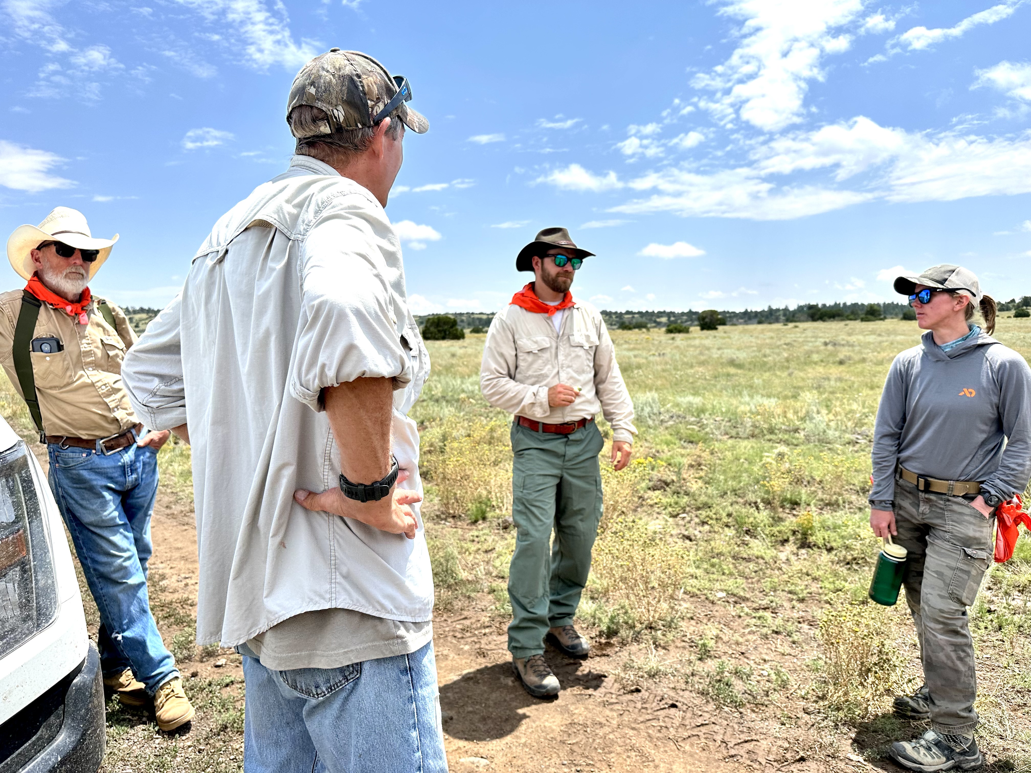 The day began with a briefing of the importance of this project by NMDGF Elk Biologist Travis Zaffarano as well as the work at hand. Driving past the many volcanic plugs we climbed up the mesa as the habitat changed to upland conifer and oak mosaic. We split into two groups and tackled the task of dropping the four strand barbed wire fencing. The wire was removed from the t-posts and old juniper posts and cut into 300' sections to be rolled up by the ranch manager. After lunch the groups headed back out, only to be met by one of New Mexico's famous summer monsoons. There was no chance to hide from the downpour, resulting in soaked blue jeans and dripping hats. The downpour was no match for the volunteers drive to remove fencing.