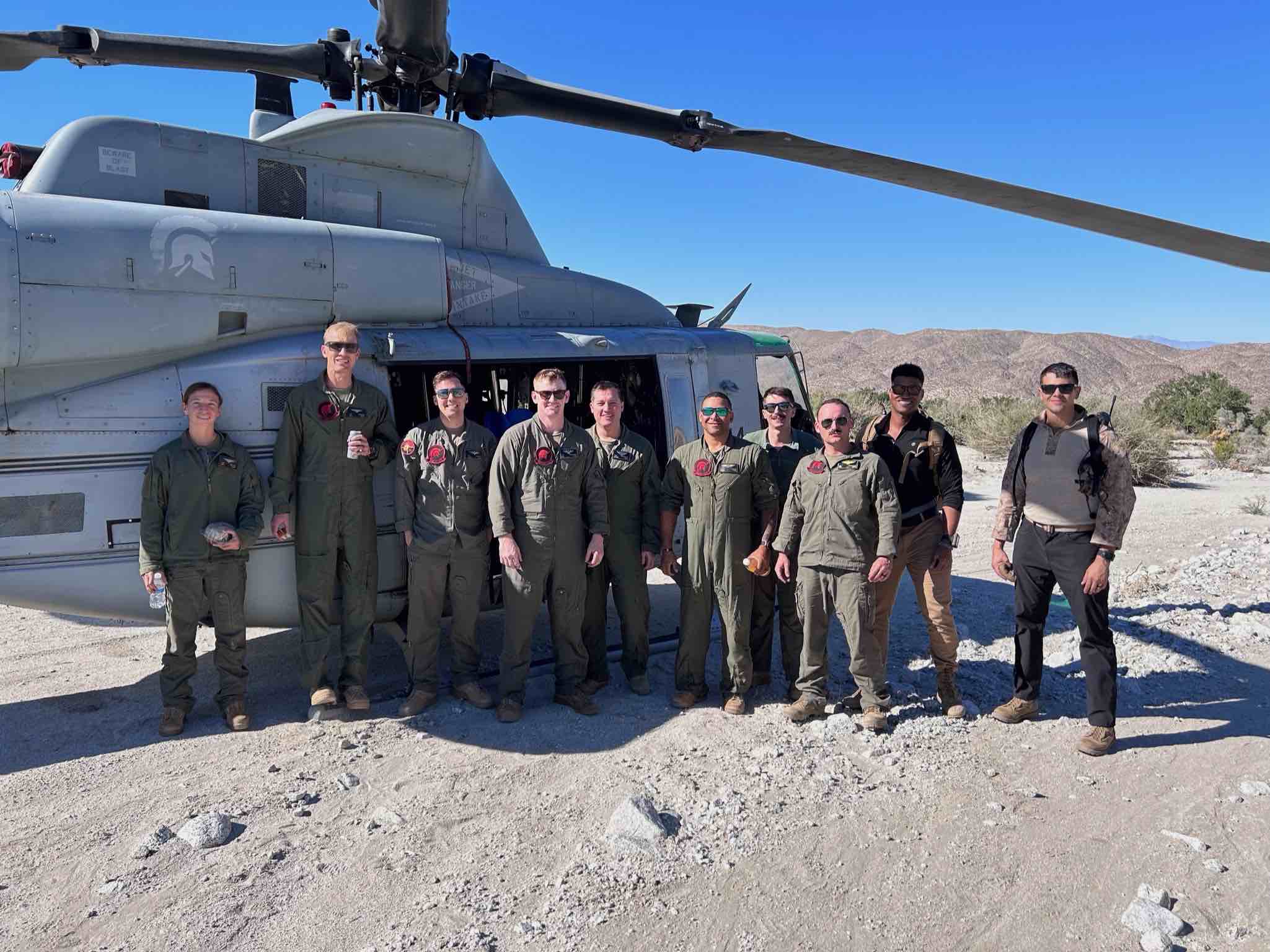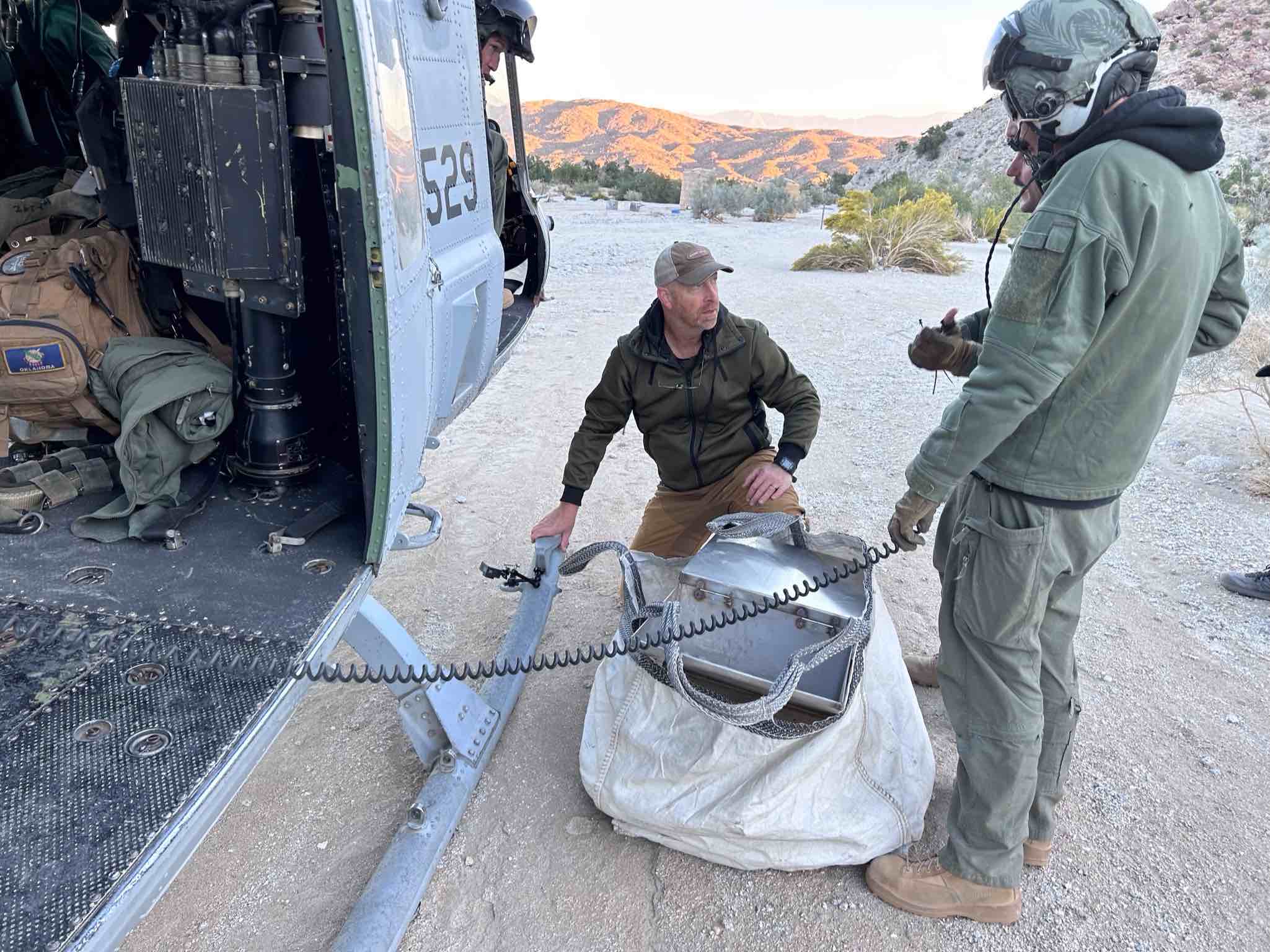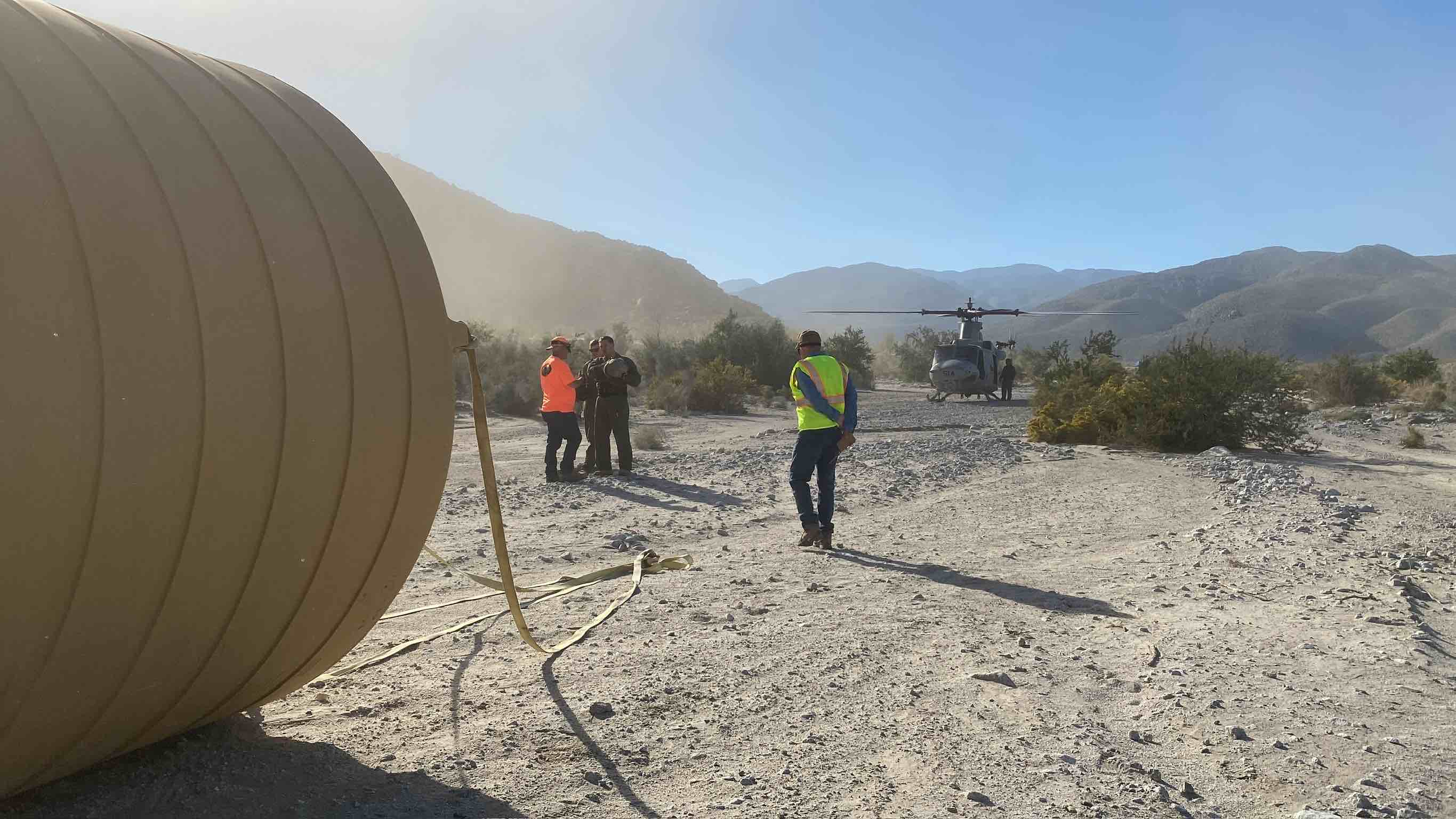 This collaborative effort involving volunteered helicopter operations and flight crews, U.S. Marines from Marine Light Attack Training Squadron 303 (HMLAT-303), using two UH-1Y helicopters from HMLAT-303, known as "Atlas," played a crucial role in removing the old water tanks and transporting the new multiple 2,500 gallon water catchment tanks, employing “long-line external lift capabilities” that were required due to the challenging terrain and remote guzzler site locations. Volunteers from BHA, CAWSF, and staff from CDFW and ABDSP hiked out to the guzzler sites in the dark to prepare for the marines, pump water between tanks and plumb the systems once the tanks were in place.