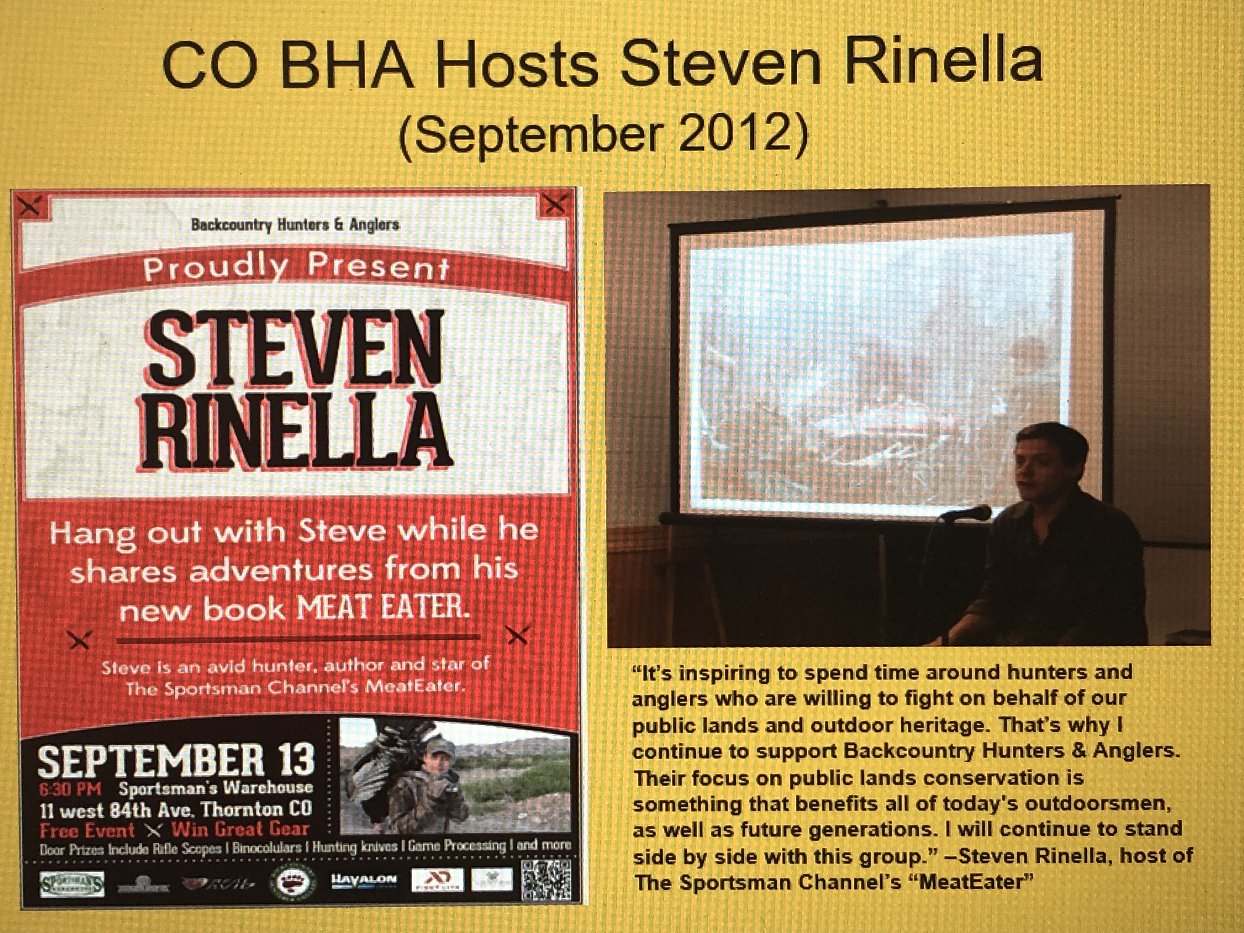 Later that fall Colorado BHA hosted Rinella for a book signing at the Sportsmen’s Warehouse in Thornton (on Sept. 13).[24] As explained in a related BHA Blog: “Rinella capped-off the evening by sharing the loss he’s experienced as his traditional … hunting grounds have been sold-off for development, prompting a call to sportsmen of all techniques to join together and speak up for the lands we all enjoy, because if we don’t, who else will?”[25]
