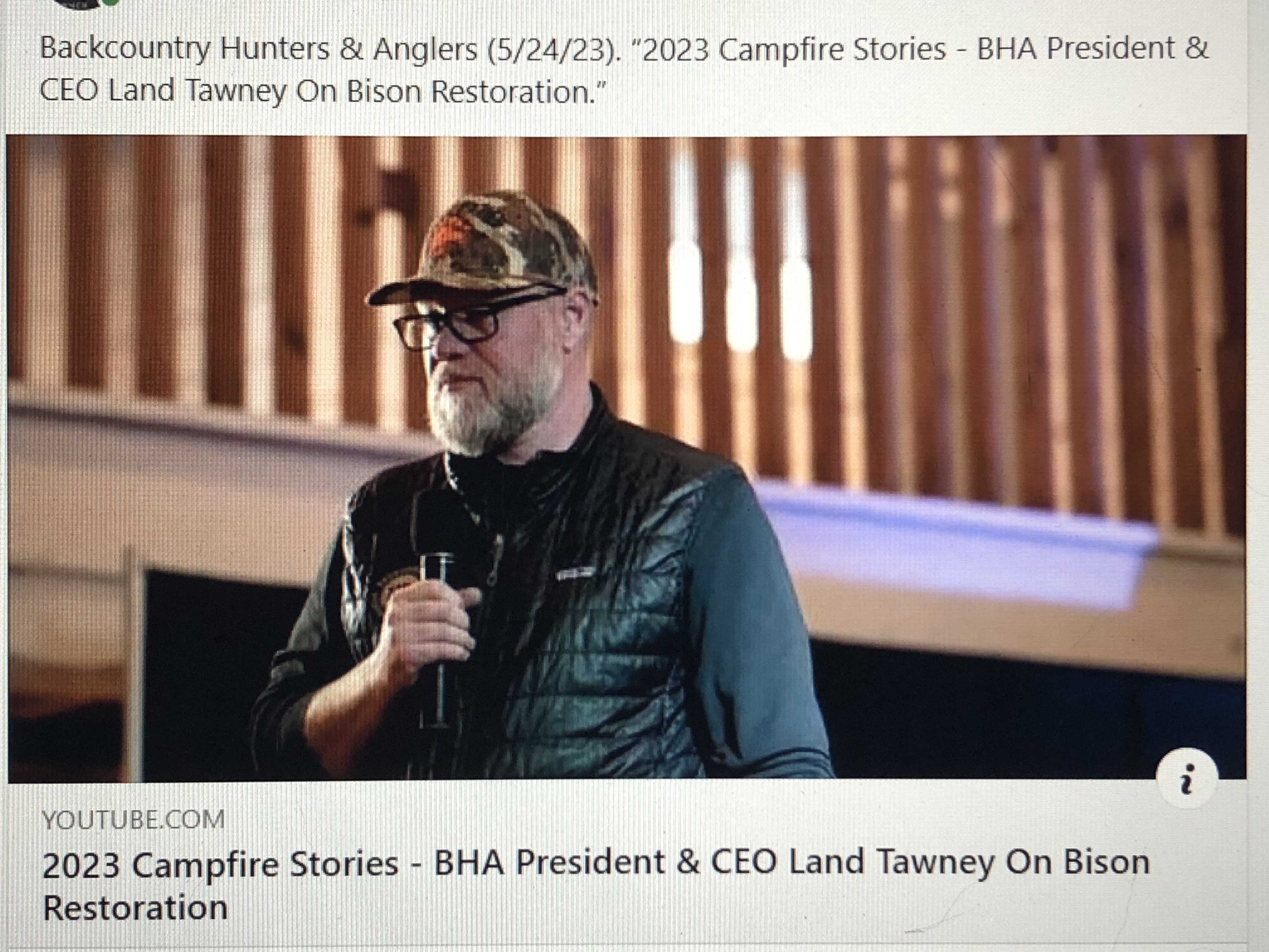 -Backcountry Hunters & Anglers (5/24/23). “2023 Campfire Stories–former BHA President & CEO Land Tawney On Bison Restoration.”
