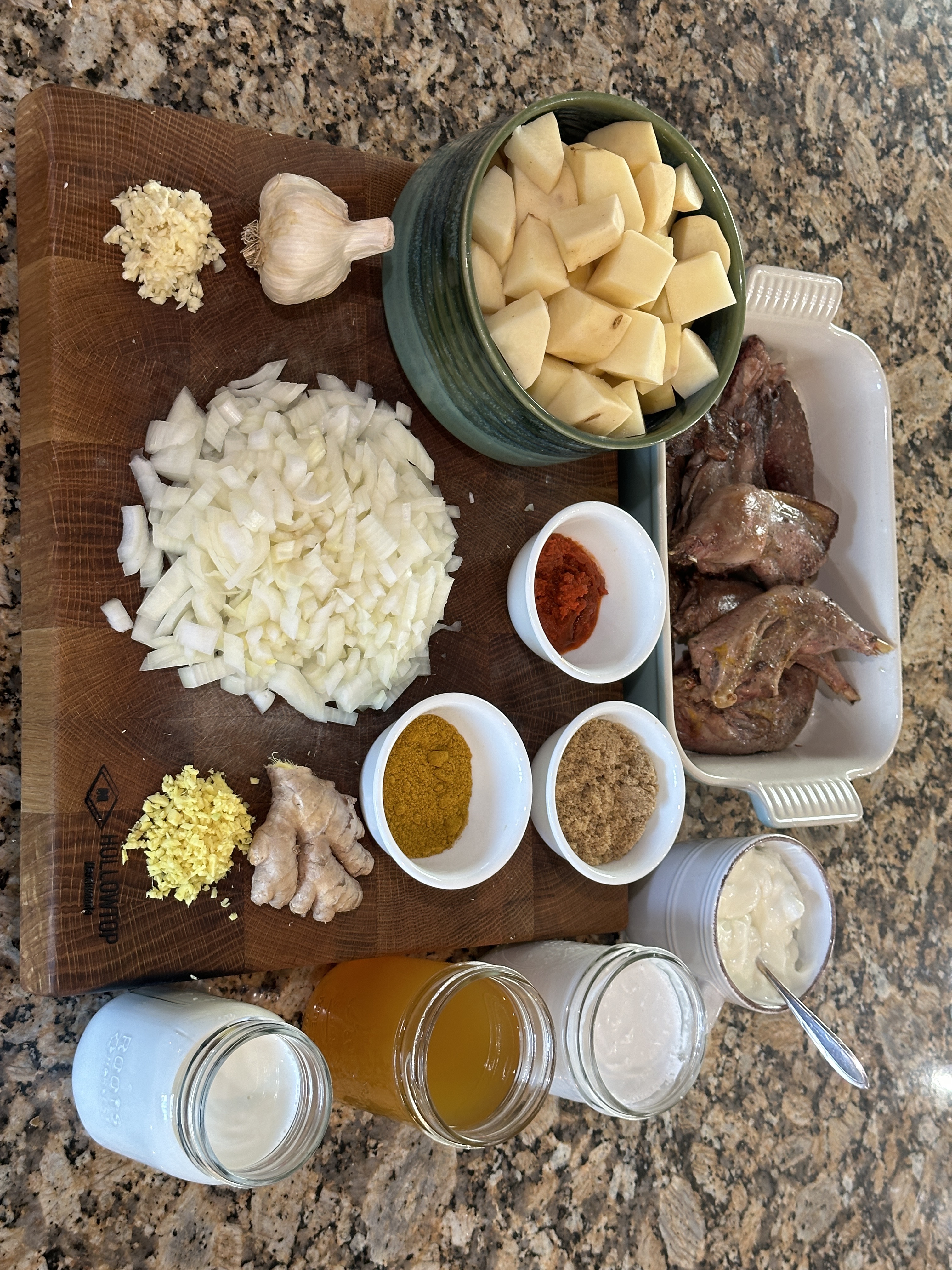 Cover and simmer for 3 ½ hours. After 3 ½ hours, add the potatoes, coconut milk and the yogurt. Mix well and simmer on low for another 30 minutes, until the potatoes are fork tender.