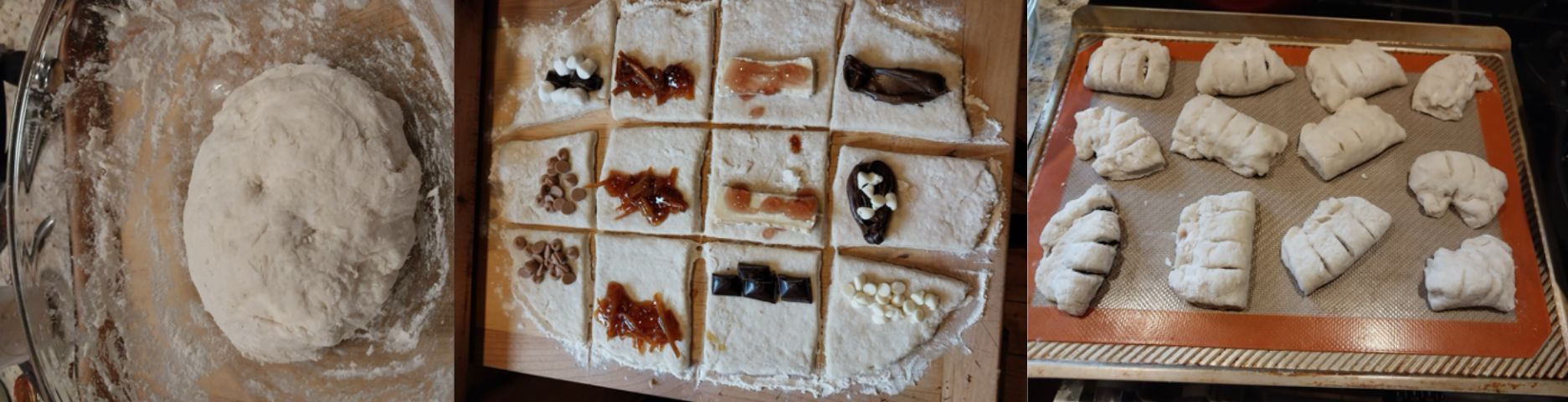 - Spread filling on one side of the dough rectangles. I use as many different fillings as fit my fancy for each batch. The more you load in there, the more they will bubble out the sides while cooking.