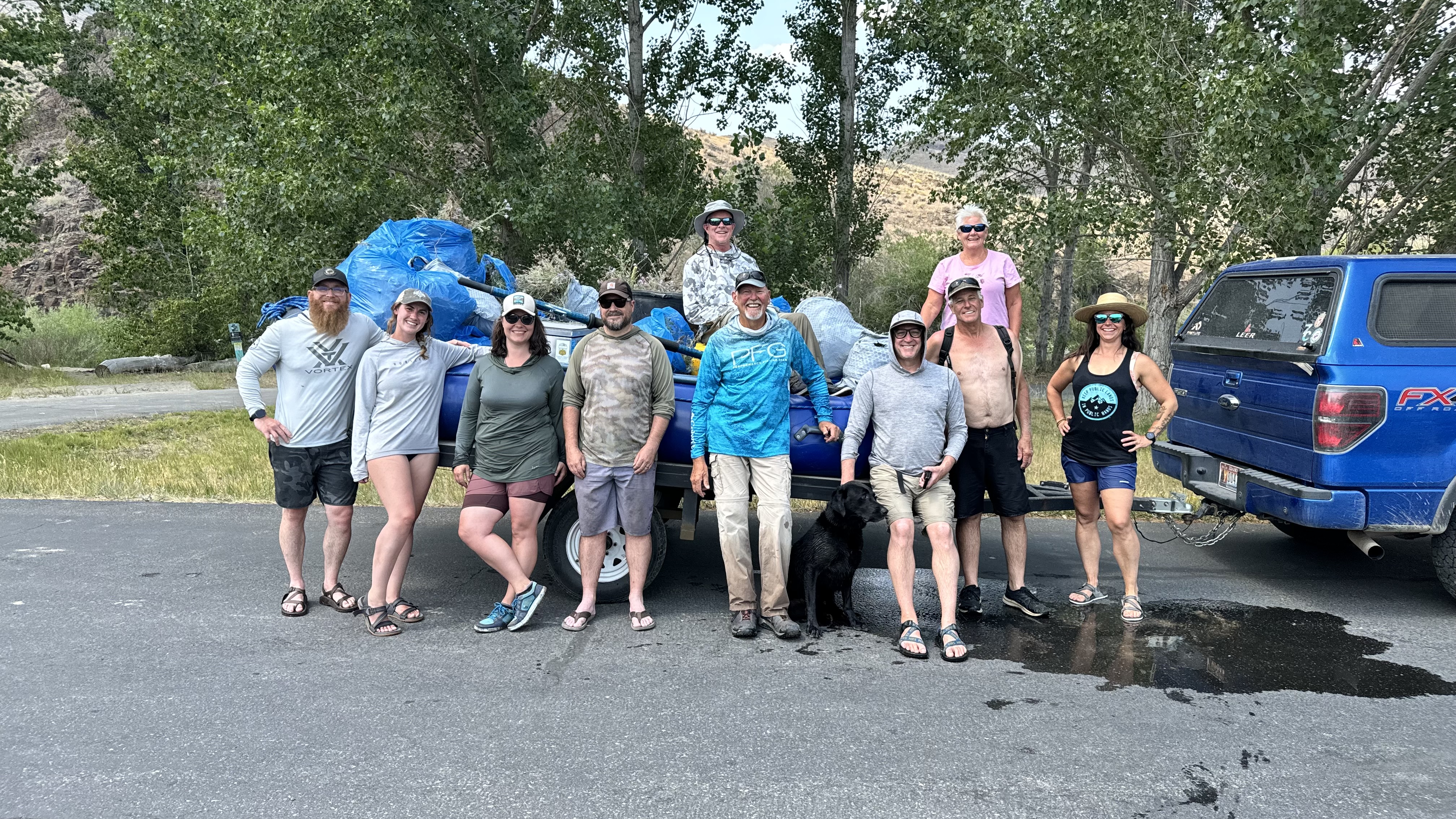 Together, twelve volunteers floated approximately five river miles in rafts and kayaks, making four stops along the way. Fifteen 55-gallon trash bags full of weeds and trash were removed from the river corridor. The group enjoyed a river-side lunch of pulled pork-style mule deer and pronghorn sandwiches, which were a hit!