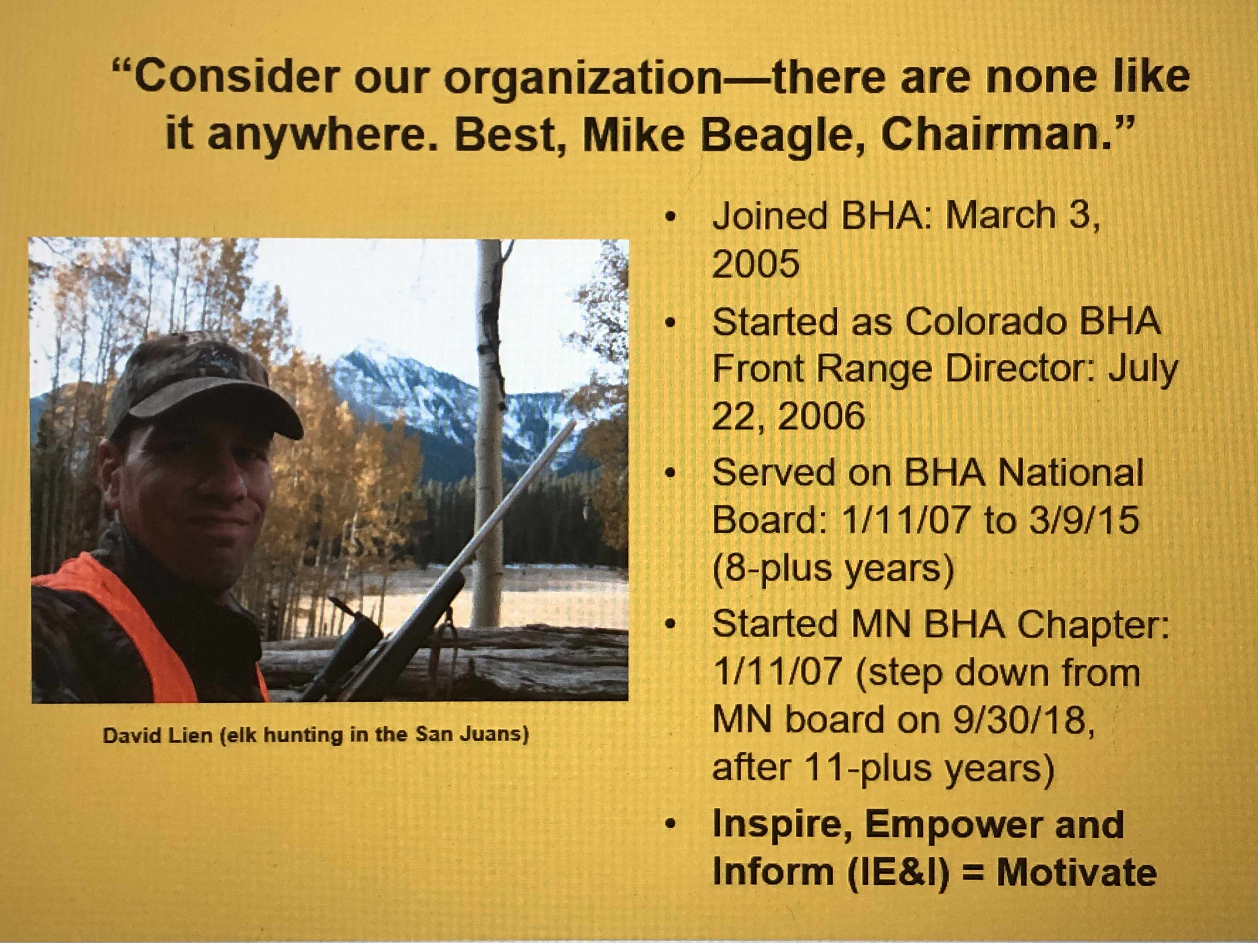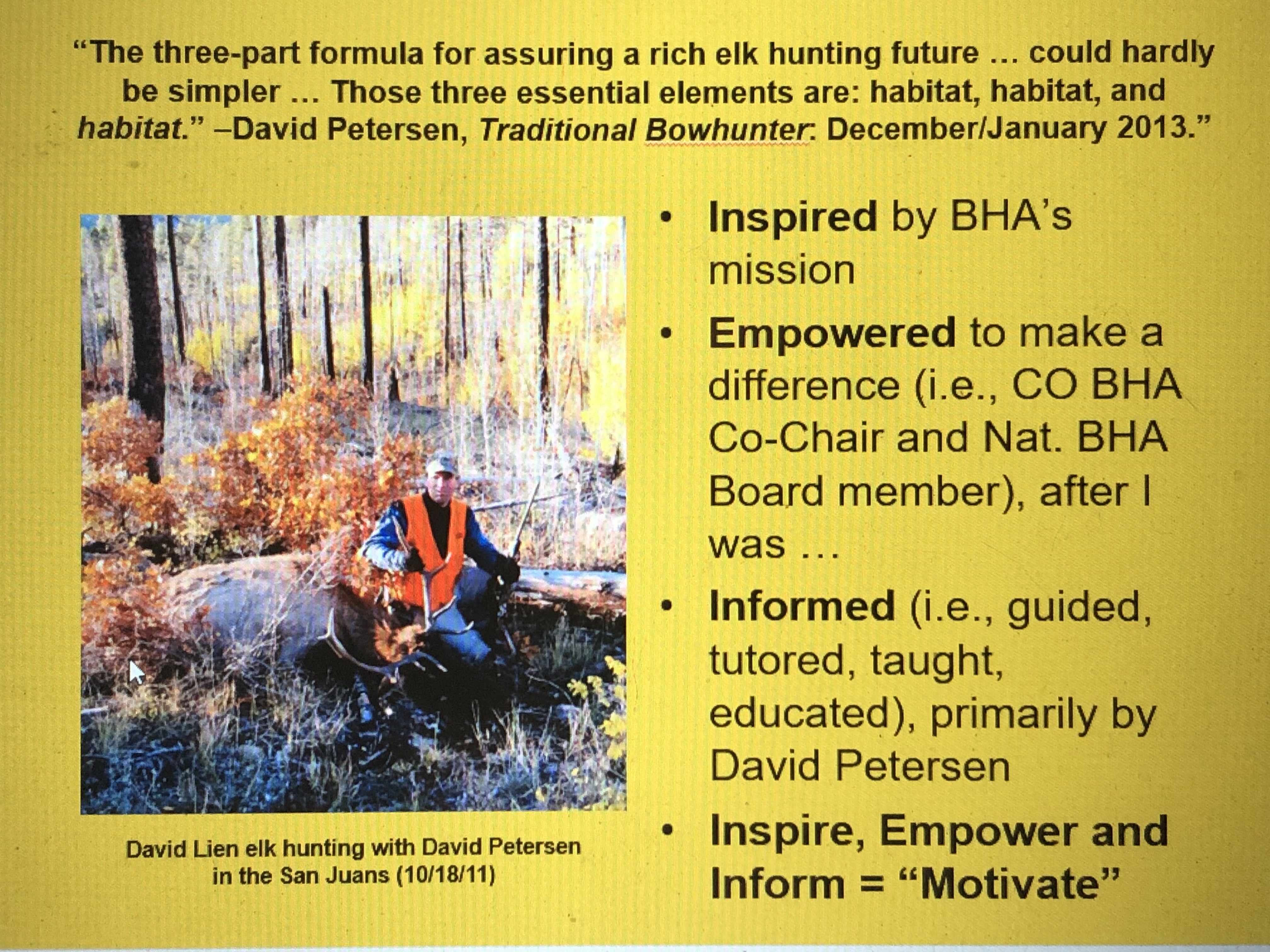 Every new Colorado BHA chapter leader receives a signed David Petersen book along with this short note. “As you may (or may not) know, David Petersen (a former U.S. Marine Corps helicopter pilot) founded Colorado BHA (the first BHA state chapter) in 2005, a year after Mike Beagle (a former U.S. Army field artillery officer) and the ‘Gang of Seven’ stood around the first BHA campfire in southern Oregon during March 2004.”[32]