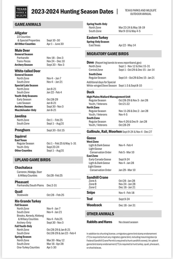 Austin, Texas – Texas Parks and Wildlife Department approved the 2023-2024 hunting regulations and season dates on March 23, 2022. No significant changes were made regarding bag limits, means, methods, and devices for hunting game animals, upland game birds, migratory game birds, or other listed animals. Some important dates to mark down on your calendar are September 1 – Dove Opener, September 9 - 24 – Early Teal, September 30 – Archery Opener for white-tailed deer, November 4 – General Season Opener for white-tailed deer, November 26 - December 2 – North Zone Split, and November 26 - December 9 – South Zone Split. You can follow the link below for more information and specifics on public hunting and drawn hunts for the 2023-2024 Texas hunting season, and check the graphic provided by TPWD.