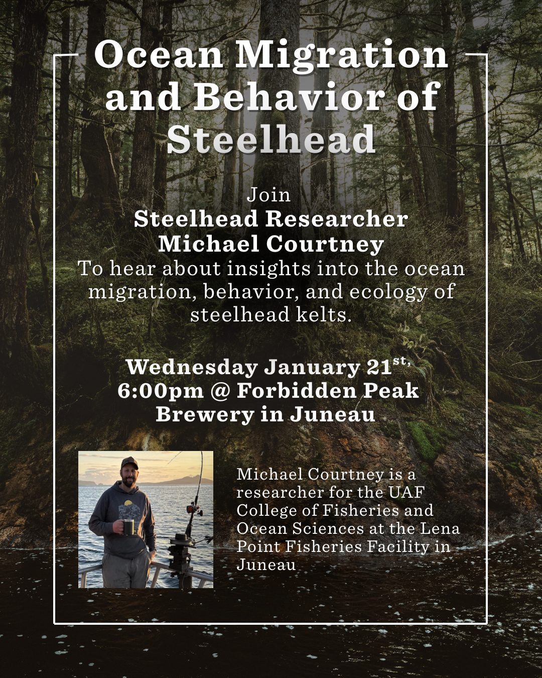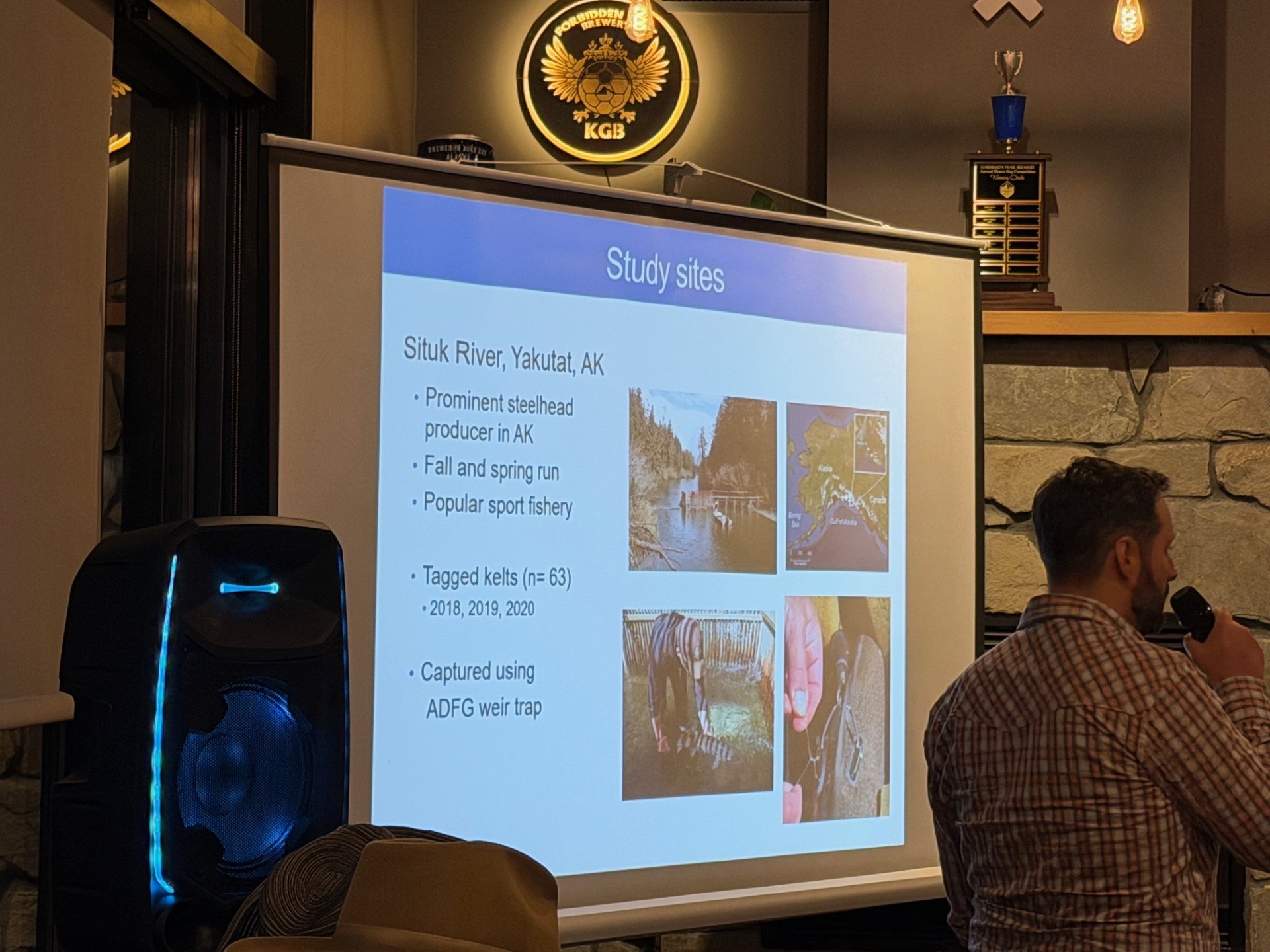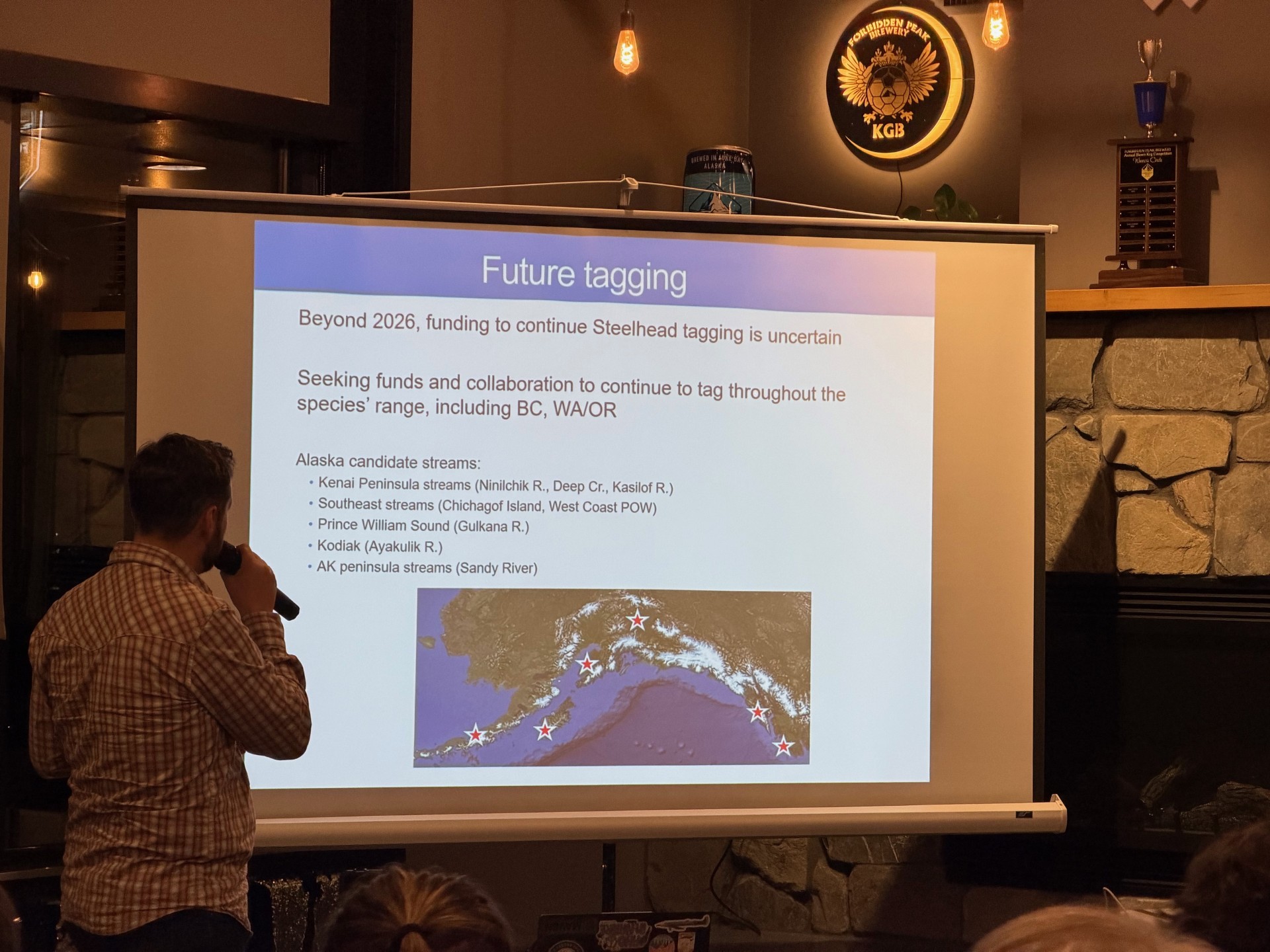 Michael shared insights from ongoing research on steelhead kelts in Southeast Alaska, exploring where steelhead travel in the ocean, how they behave after spawning, and why this life stage is essential for maintaining resilient steelhead populations. Attendees gained a deeper understanding of the connections between healthy rivers, connected marine systems, and sustainable angling access—key principles for both Trout Unlimited and Alaska BHA.