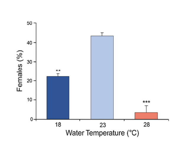Effect of temperature on Southern Flounder sex determination Percentage of female southern flounder from replicate experiments (mean ± ) at temperatures of 18, 23 and 28 °C(n = 64, 53, and 49, respectively, with 20–34 fish/temperature/replicate).