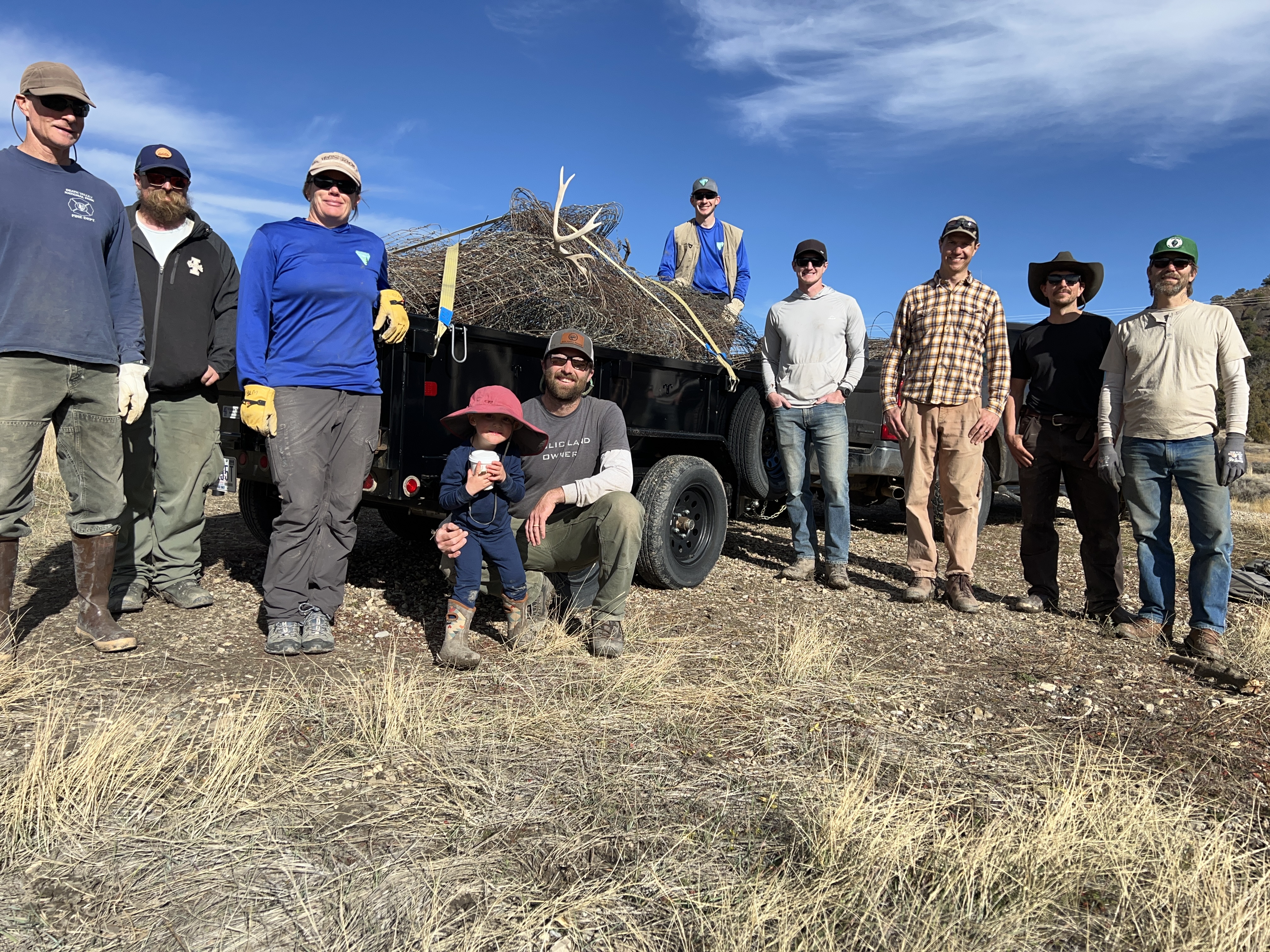 The start of the morning was cold and very muddy due to weather for the week prior, but it dried up through the day. We pulled all the fencing in about 3 hours, then hauled it another quarter mile back to the trucks and dump trailer. During the work we had lots of great conversations, found some new hunting partners, and even found a couple mule deer sheds.