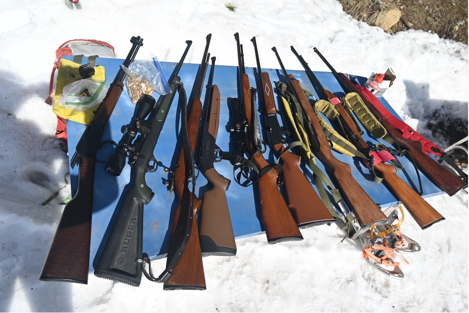 A table full of .22LR - all of them legal in our biathlon - none of them legal in the Olympics.