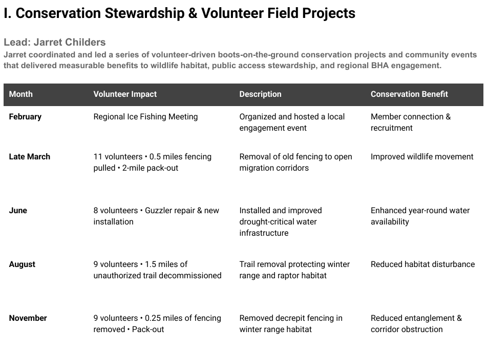 Between February and November 2025 Jarret organized and led five stewardship projects or activities including: 1.) February: a regional ice fishing meeting/local engagement event; 2.) March: a fence pull with 11 volunteers removing a half mile of fencing combined with a two-mile pack out; 3.) June: a guzzler repair and installation with 8 volunteers; 4.) August: an illegal trail removal (1.5 miles) impacting winter big game and raptor habitat; 5.) November: a fence pull with 9 volunteers removing a quarter mile of decrepit public lands fencing.